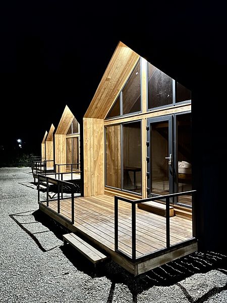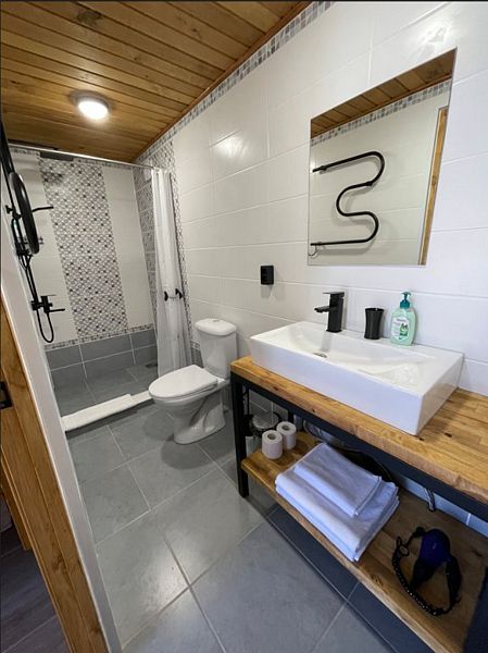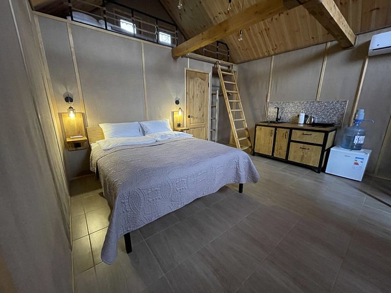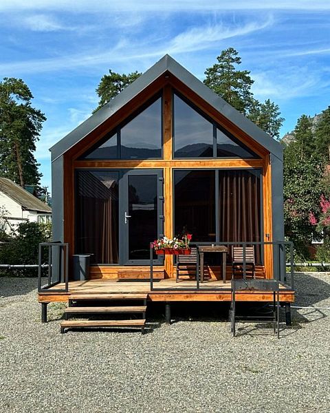 Комфортабельный дом для двух человек с возможностью добавления двух дополнительных мест предназначен для круглогодичного использования и занимает площадь 24 кв.м. Внутри Вы найдете двуспальную кровать с ортопедическим матрасом размером 160x200 см, а также кухонную зону с необходимым набором посуды, электрическим чайником, индукционной плитой и холодильником. В ванной комнате есть душ. Прилагаются полотенца, фен и туалетно-косметические принадлежности.