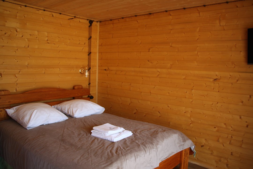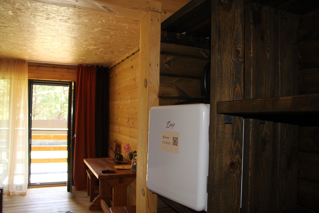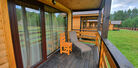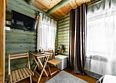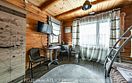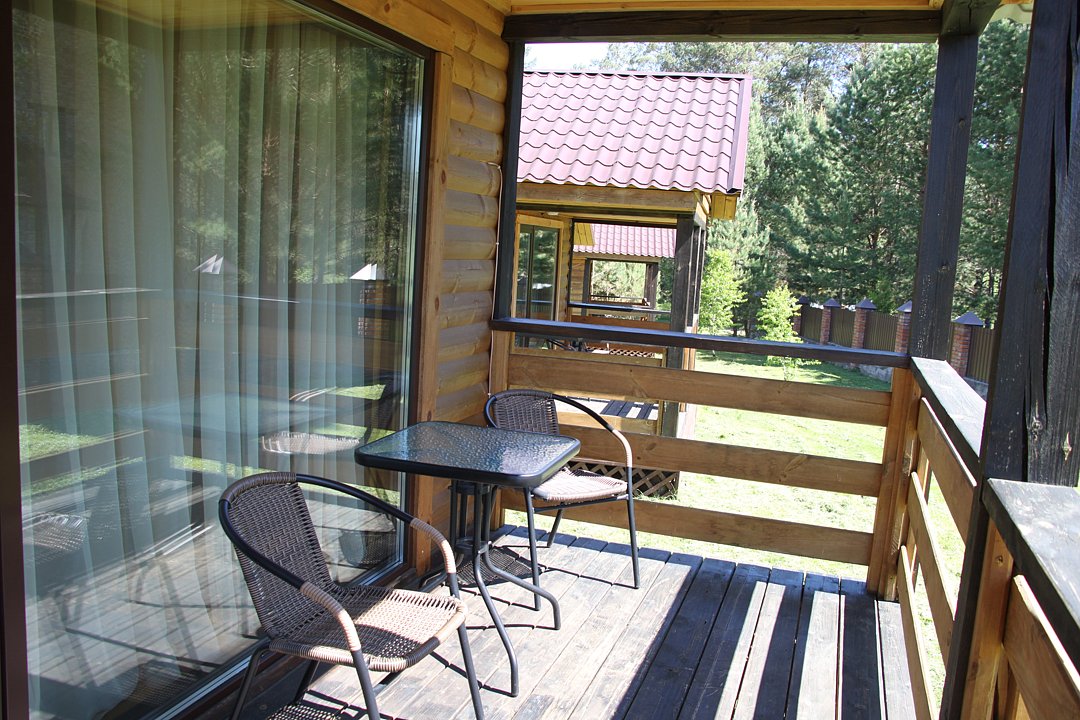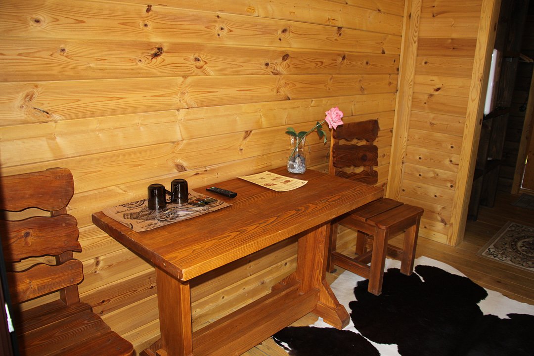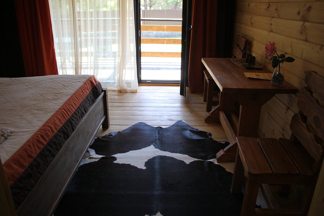 На террасе для отдыха размещены кресла и столик. Домик рассчитан на проживание одного/двух гостей. В шале представлена деревянная мебель ручной работы: двуспальная кровать, стулья, стол.