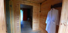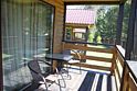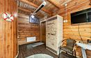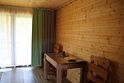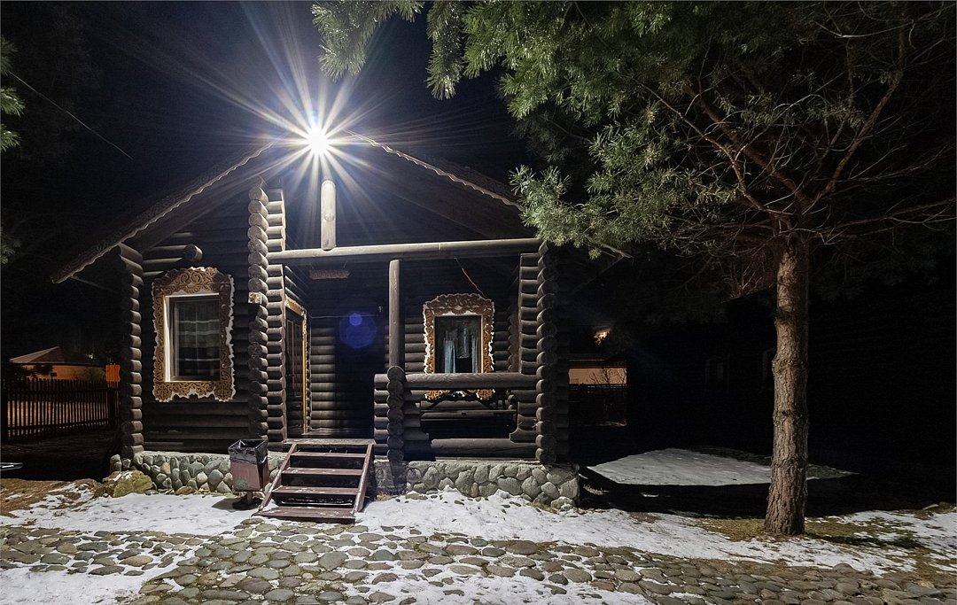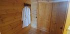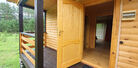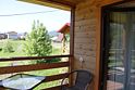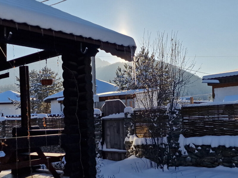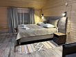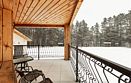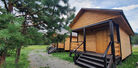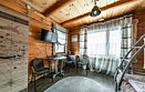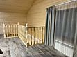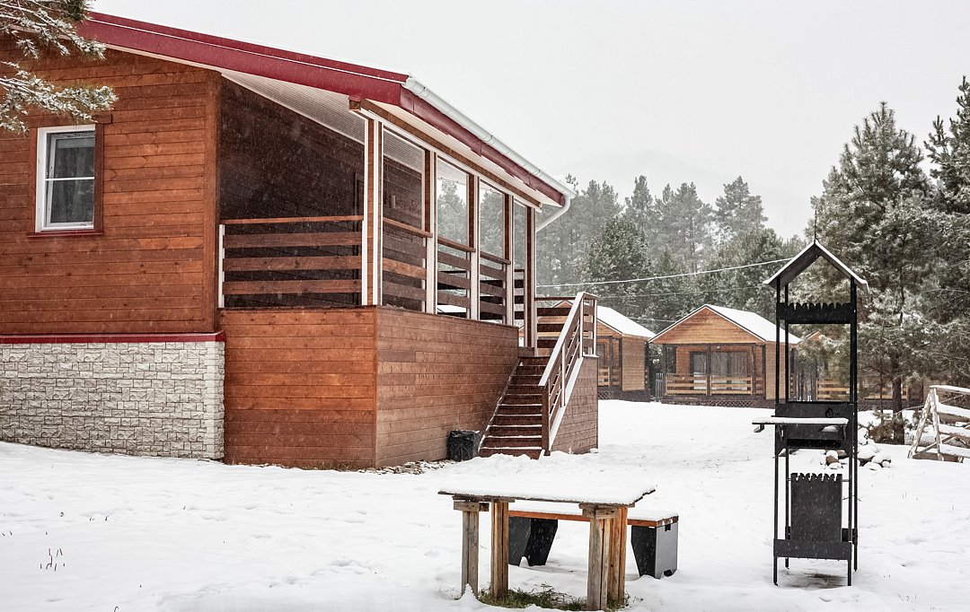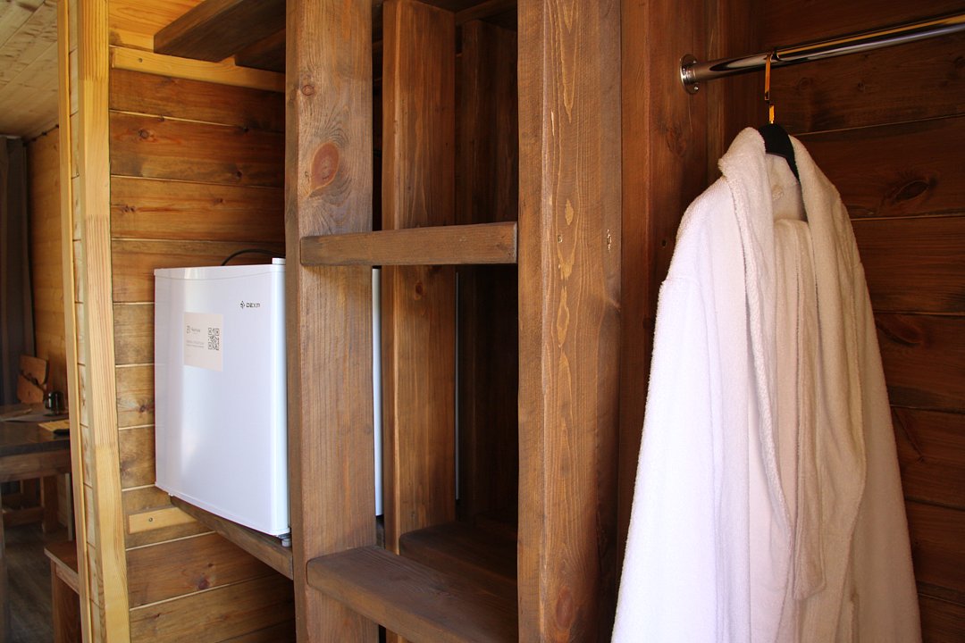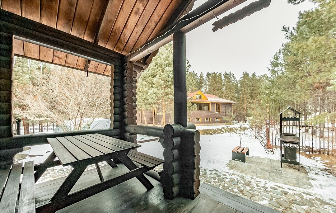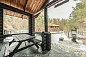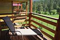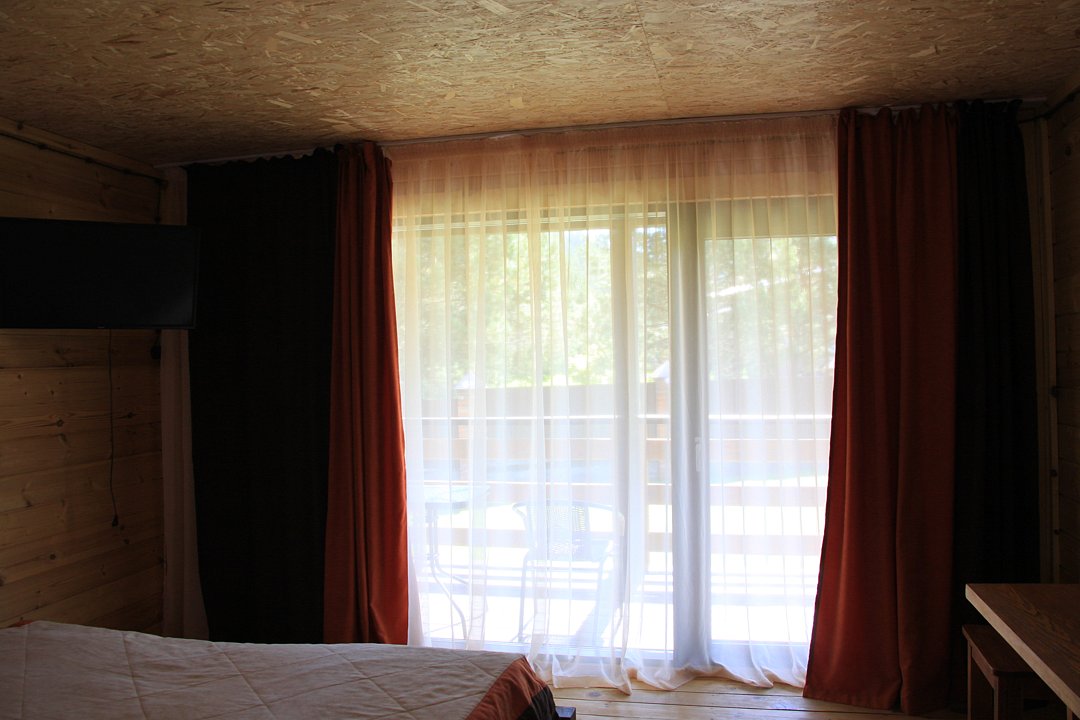 На террасе для отдыха размещены кресла и столик. Домик рассчитан на проживание одного/двух гостей. В шале представлена деревянная мебель ручной работы: двуспальная кровать, стулья, стол.
