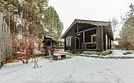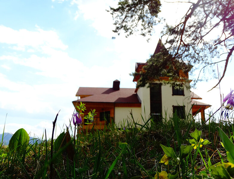 Летний деревянный домик на склоне холма с выходом на просторную террасу.