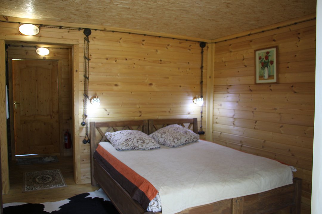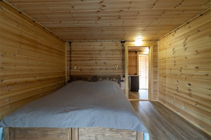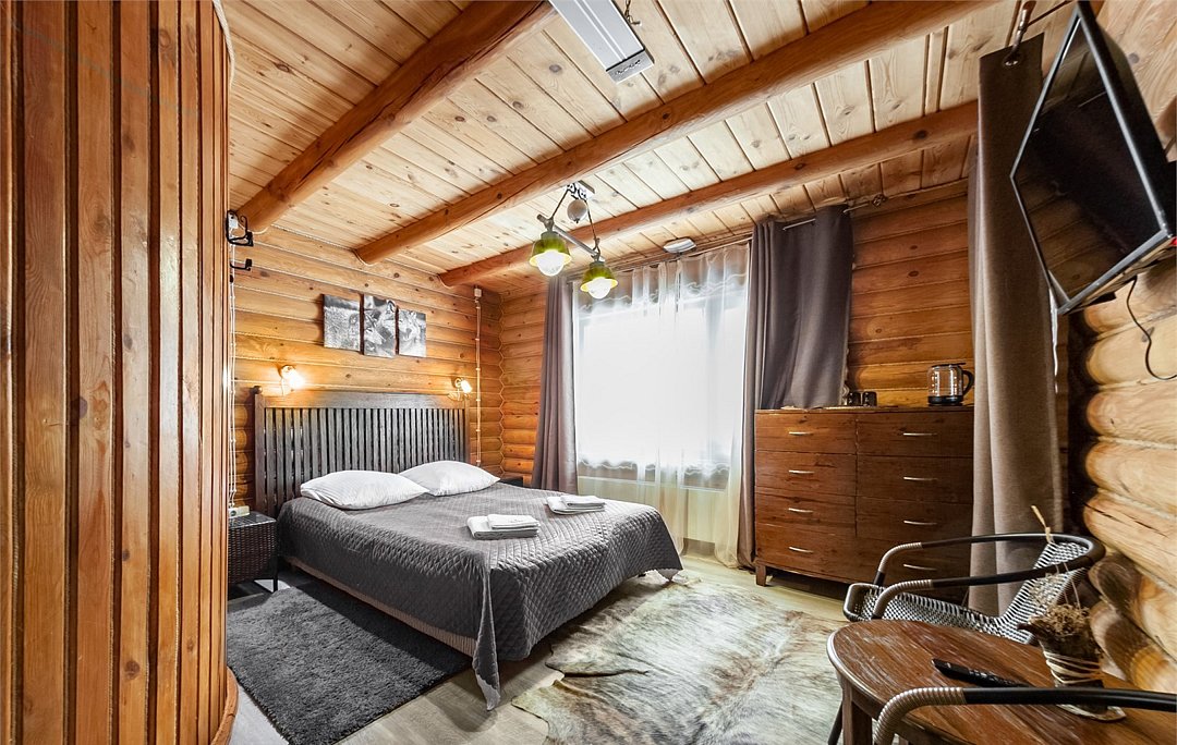 В домике деревянная мебель ручной работы: двуспальная кровать, стулья, стол, телевизор и мини-холодильник.