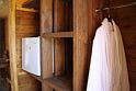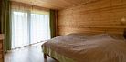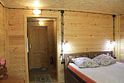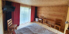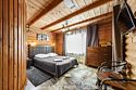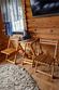 В шале представлена деревянная мебель ручной работы: двуспальная кровать, стулья, стол.