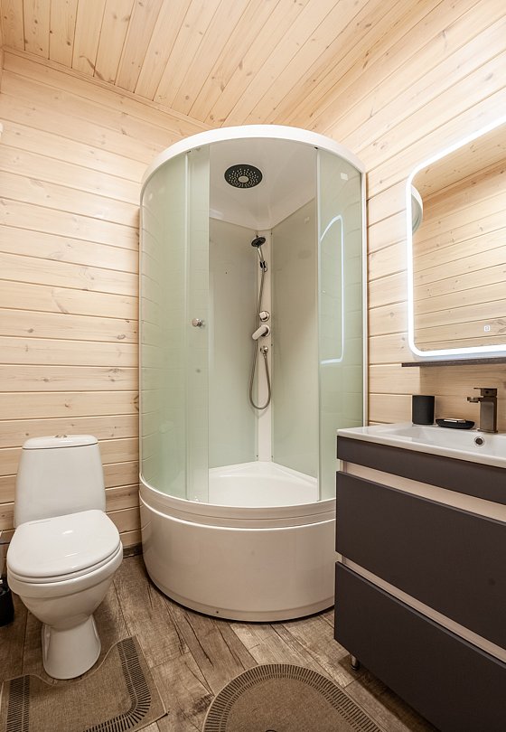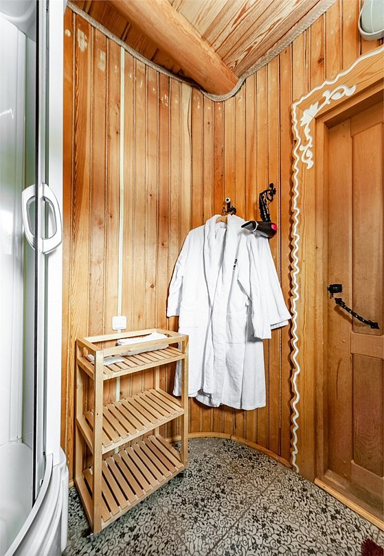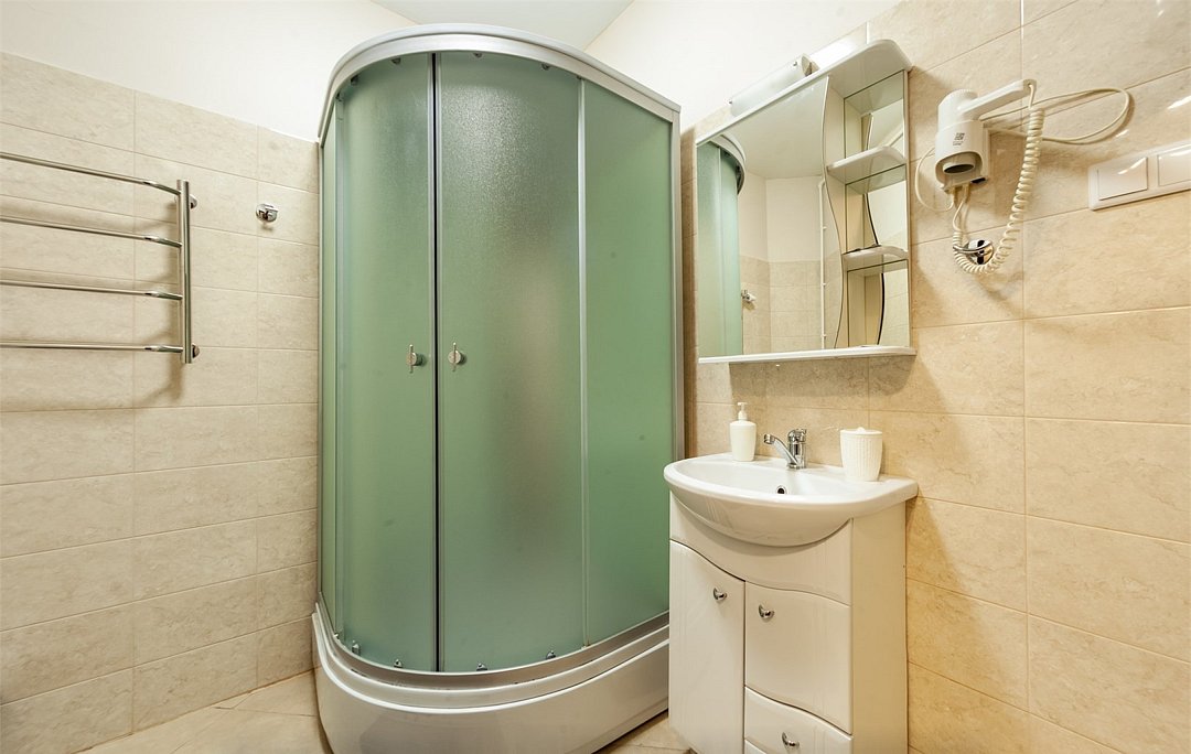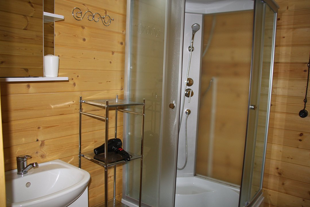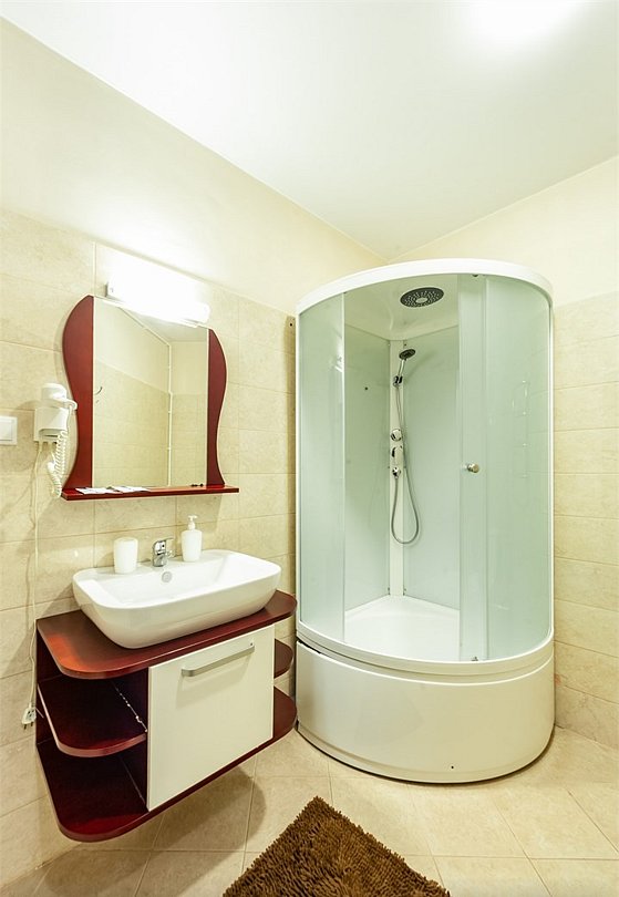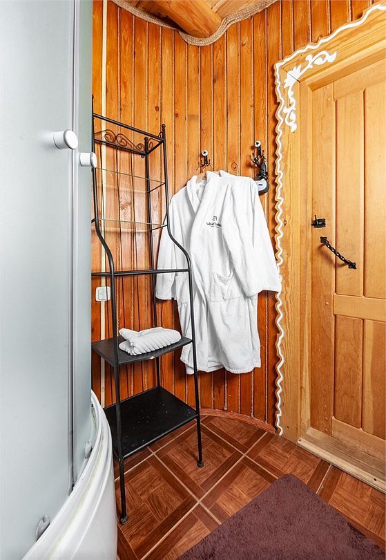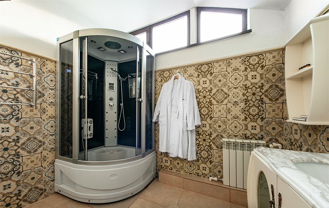 Туалетная комната с душевой кабиной укомплектована полотенцами, феном, мини-парфюмерией, халатами и тапочками.