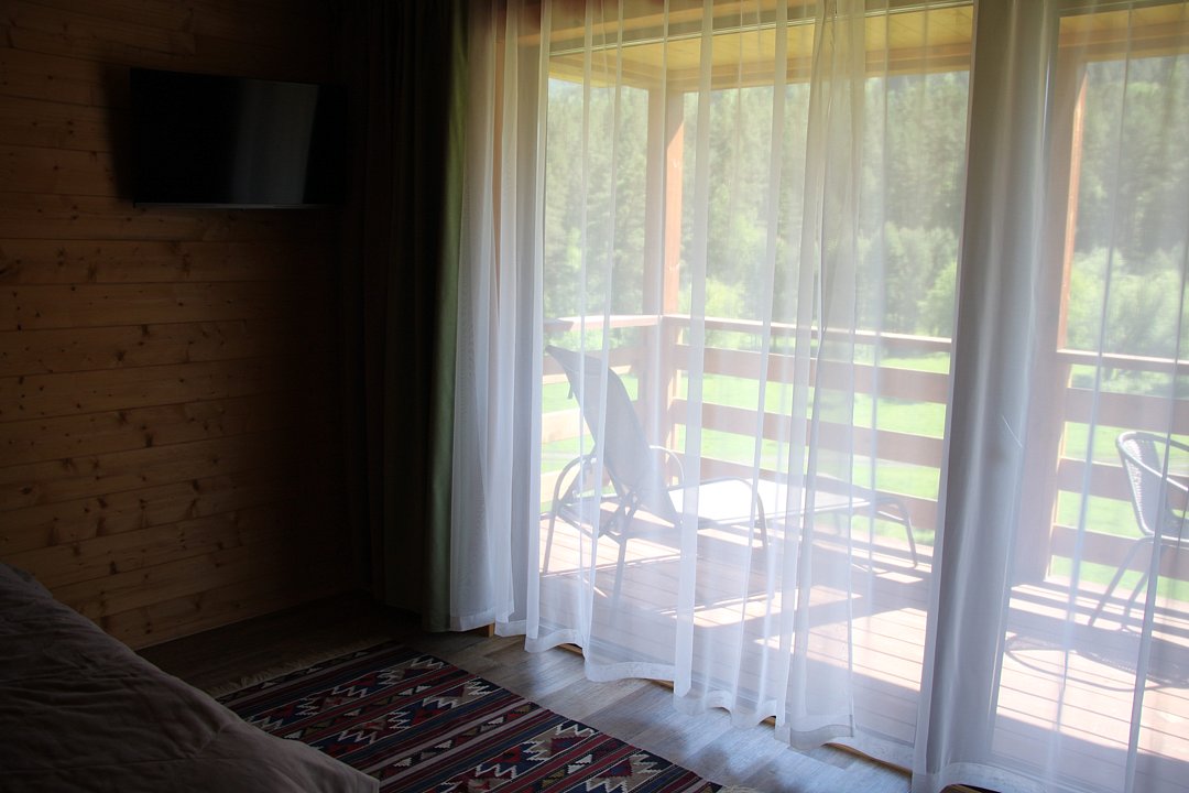 В каждом есть выход на просторную террасу, с которой открывается завораживающий вид на зеленые горыи лес.
