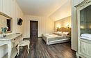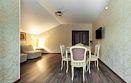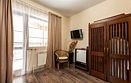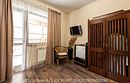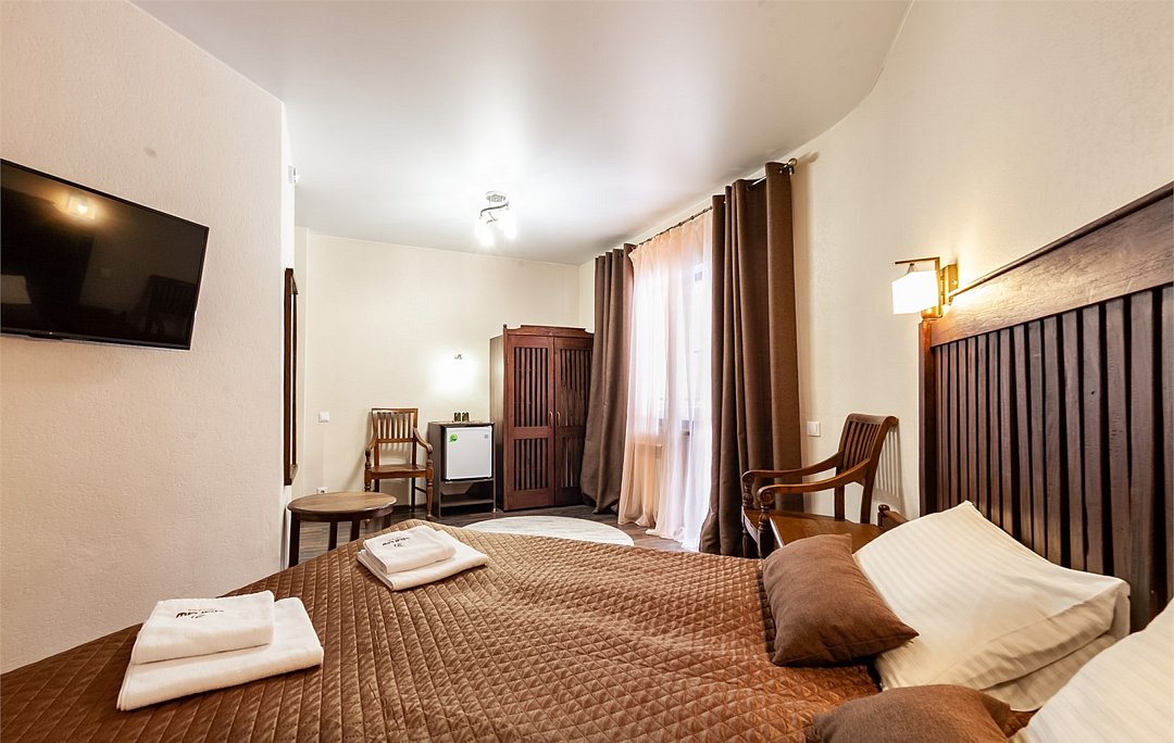 В комнате у окна с видом на террасу стоит небольшой столик, с чайником, чайными чашками и стульями. Предоставляются чай, кофе в индивидуальной упаковке. В номере есть телевизор и холодильник. Туалетная комната с душевой кабиной укомплектована полотенцами, феном, мини-парфюмерией.