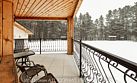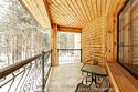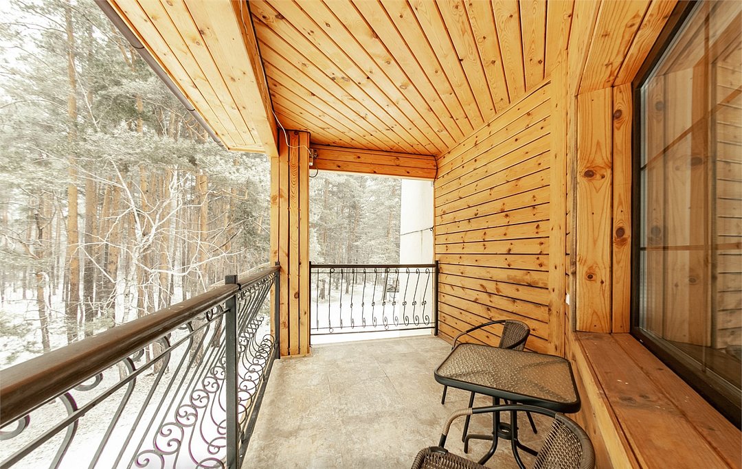 Отдельный балкон с видом на сосновый бор и зону для отдыха с красивой плетеной мебелью.