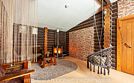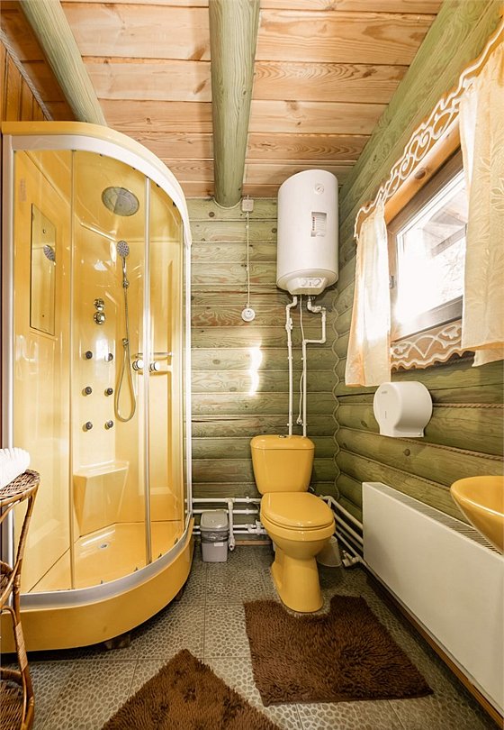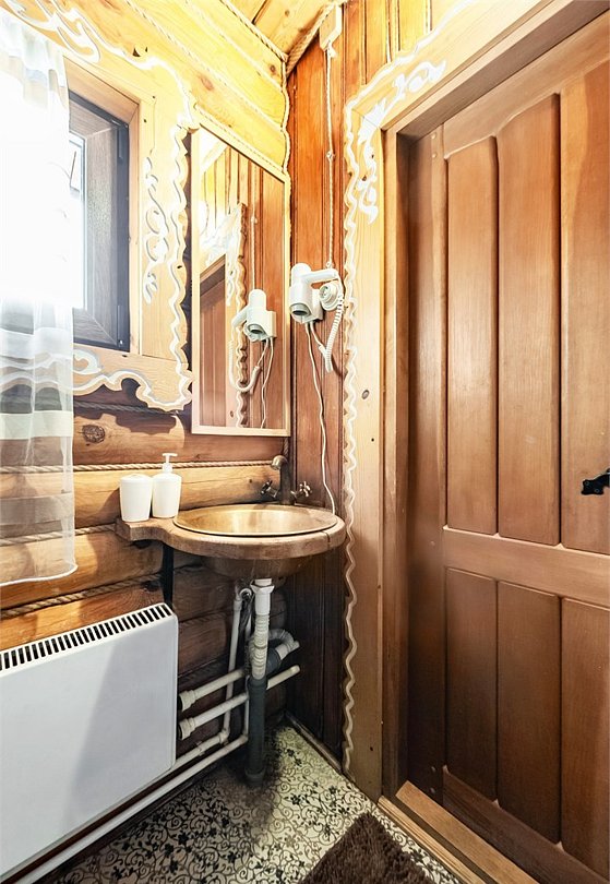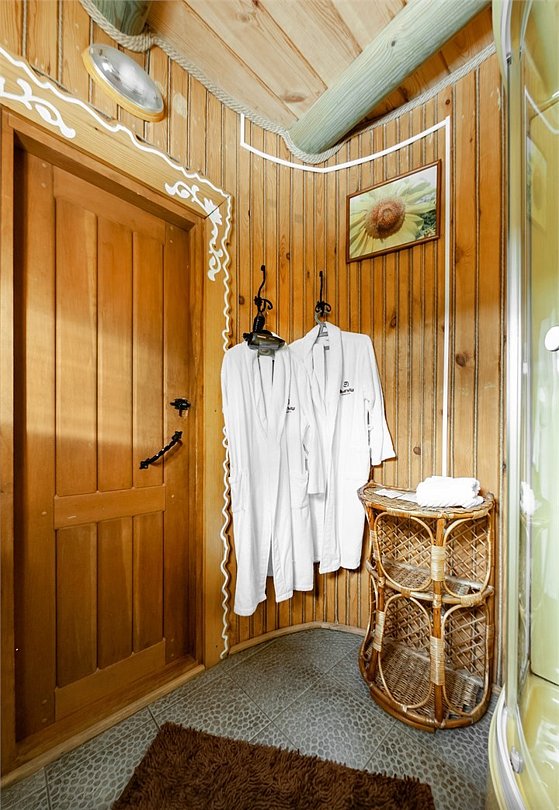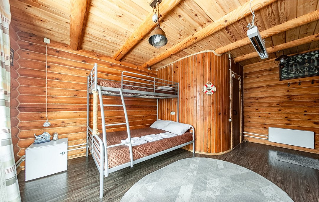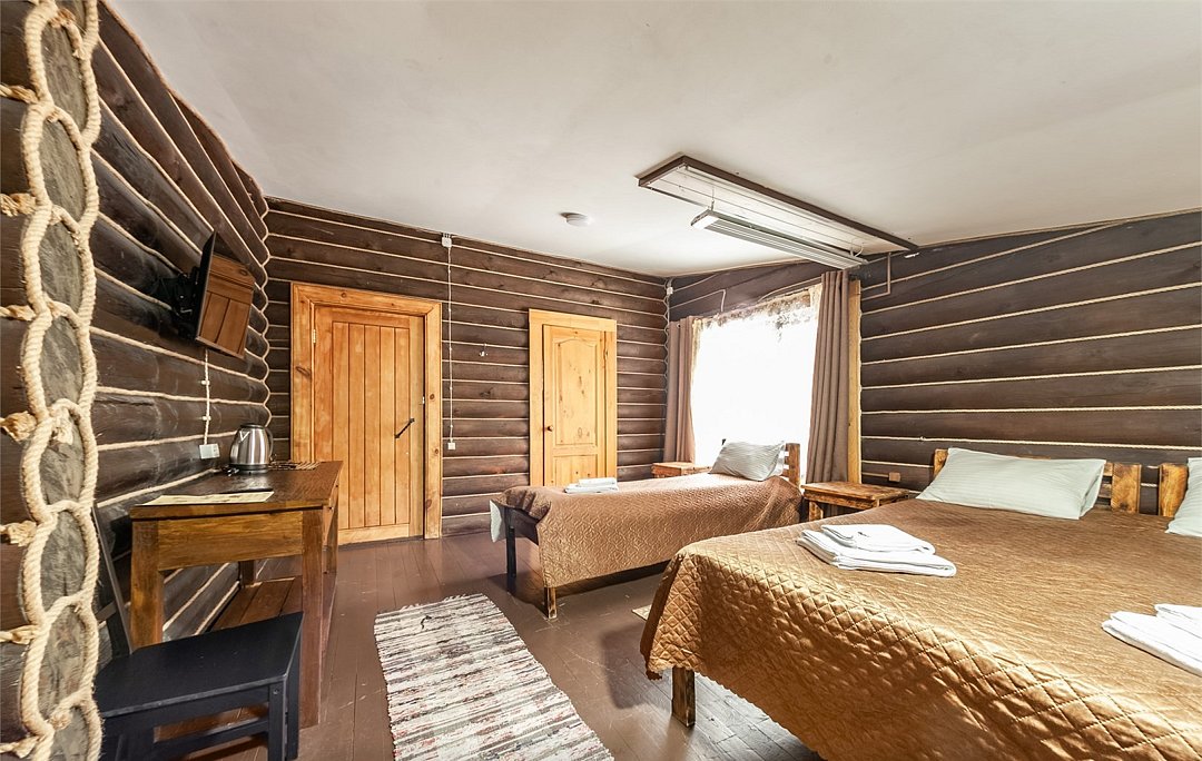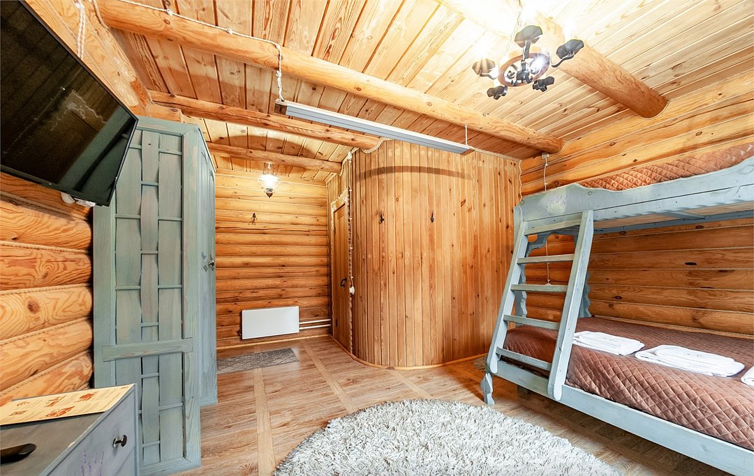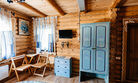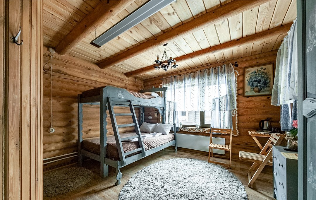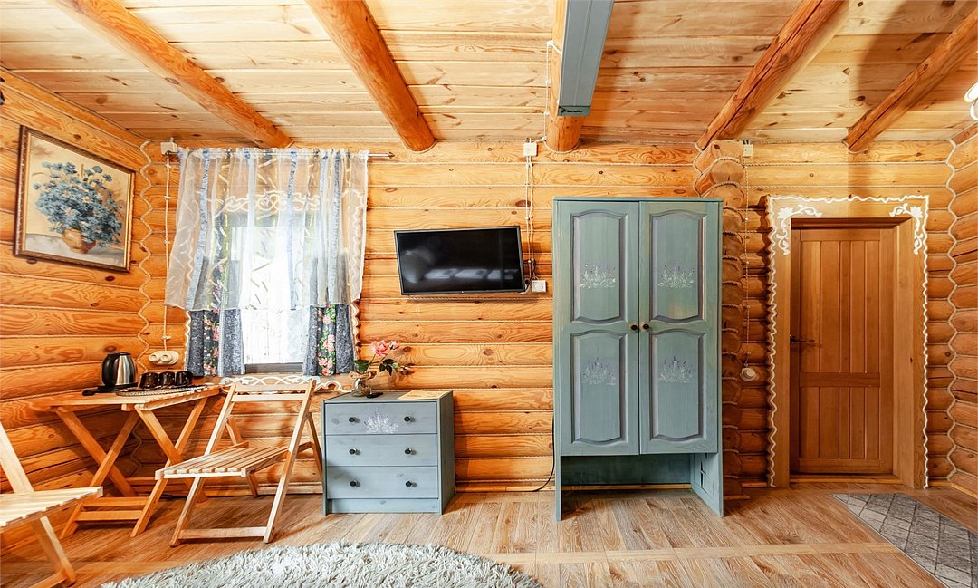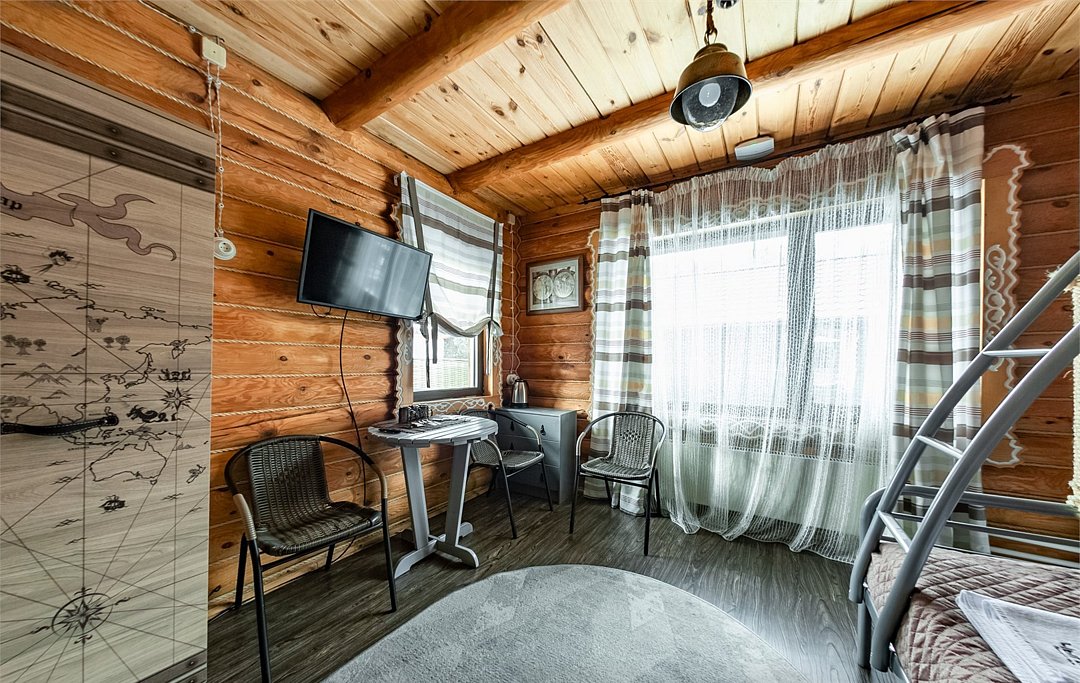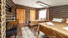 Этот номер украшен картинами с цветущими подсолнухами, бревенчатые стены покрашены в светлые оттенки желтого цвета.