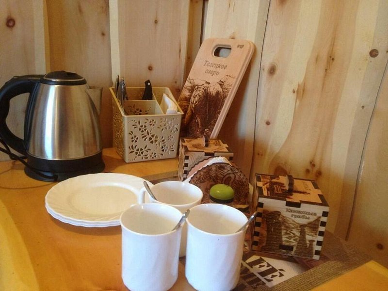 От дома можно пройти дальше по улице до кафе " Баба-яга" - примерно 500 м. ( простая пища за неадекватные деньги, но с улыбкой и радушием) или спуститься на машине в Артыбаш от развилки на лево летом работающие кафе (около 2 км), на право круглогодичный сервис примерно 3 км.там разберетесь.На верх в гору до высоты 771 м над уровнем моря - Ресторан "Телецкий чай",отдельный отзыв
