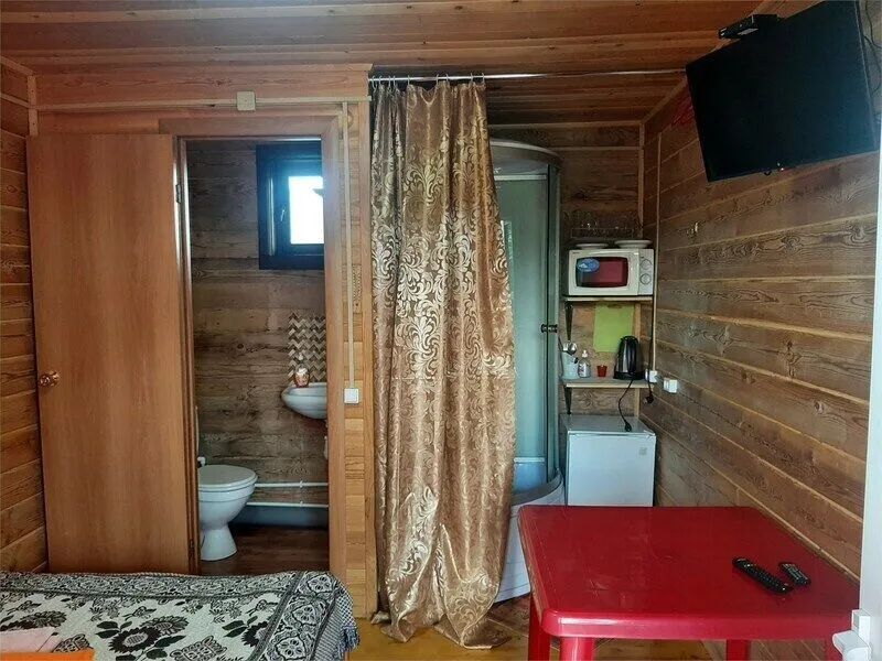Трехместный номер с душевой кабиной, микроволновкой и двухъярусной кроватью.