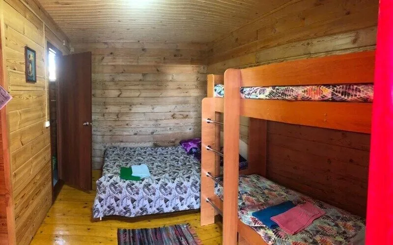 Семейный номер с большой двухспальной кроватью (ширина 160 см) и двухъярусной кроватью. В номере имеется душевая с санузлом, мини-кухня (печь СВЧ, чайник, посуда, столовые приборы, холодильник). В бесплатное пользование включено постельное белье, полотенца, душевые принадлежности, сменная обувь. На входе в номер имеется зона отдыха.