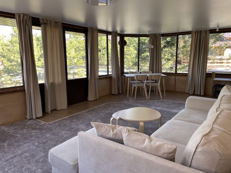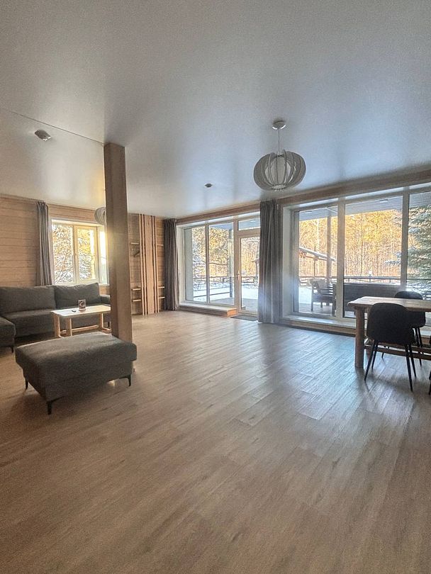 Двухкомнатный номер в трехэтажном коттедже. Общая гостиная зона с камином, уютными диванами, кухонной зоной. Балкон дает возможность наслаждаться местными пейзажами.