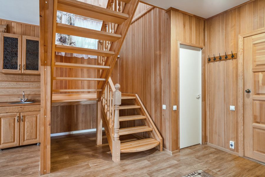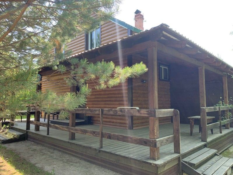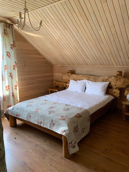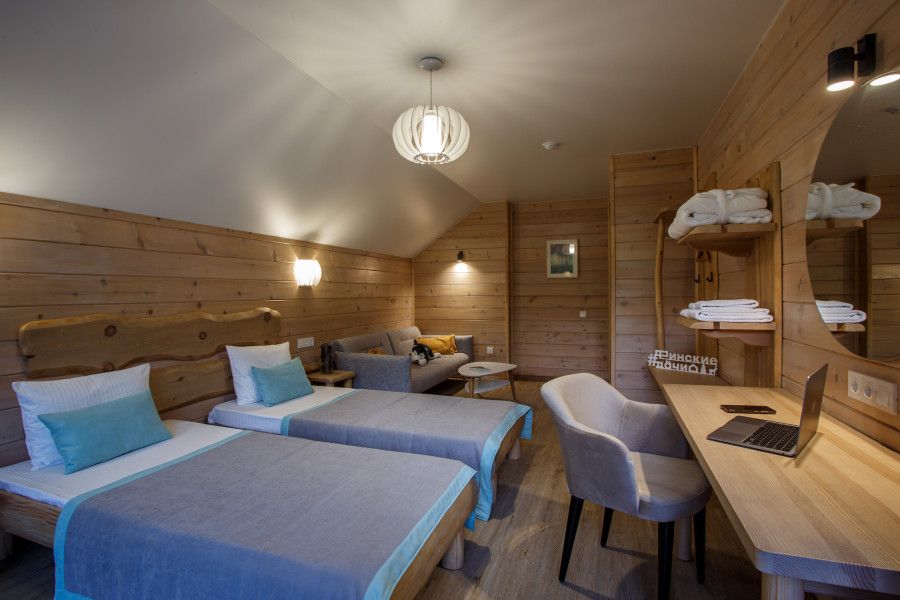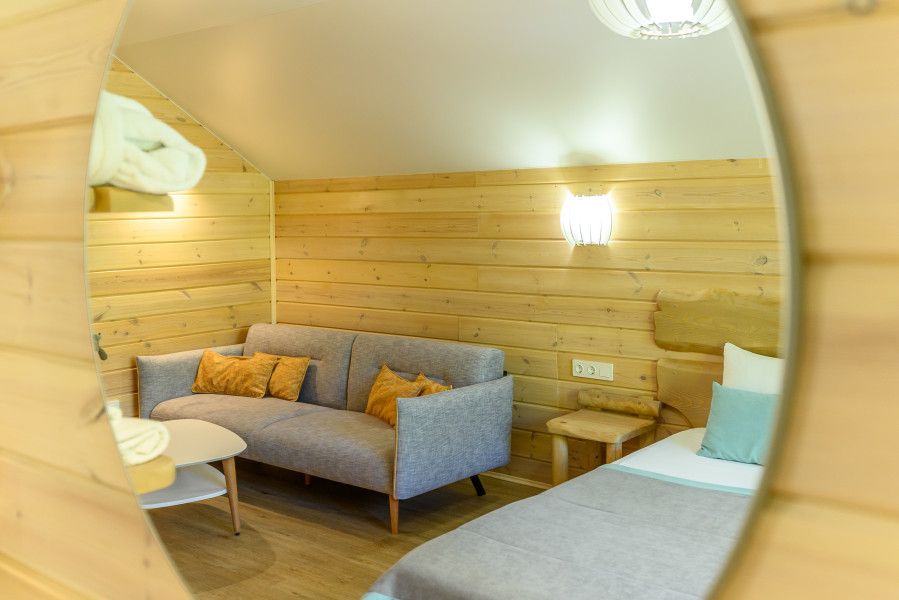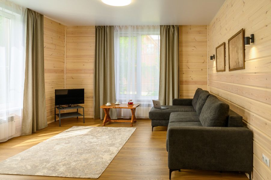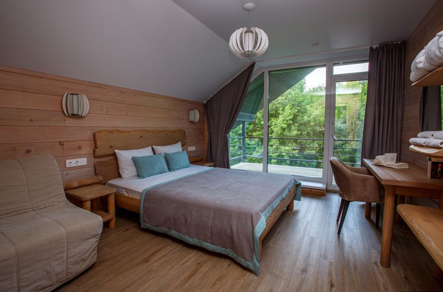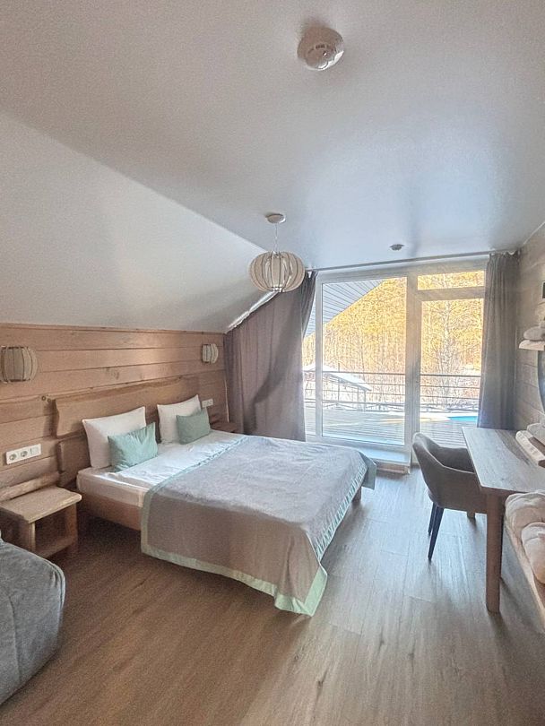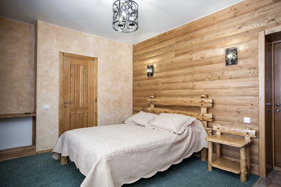 В коттедже есть отдельная спальня, уютный зал с кухонной зоной, холодильник и сейф. Интерьер украшен мебелью ручной работы, а панорамные тонированные окна наполняют пространство светом и ощущением простора.