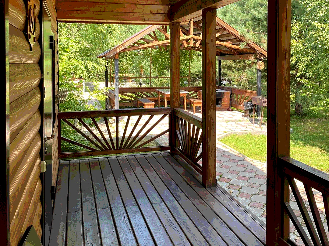 спальня, зал с кухонной зоной, холодильник, кондиционер, панорамные тонированный окна, веранда, мебель ручной работы, Wi-Fi. Обособленная территория. Собственная мангальная зона. Проход к берегу Катуни через общий выход.