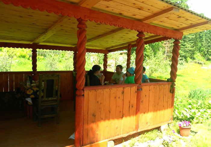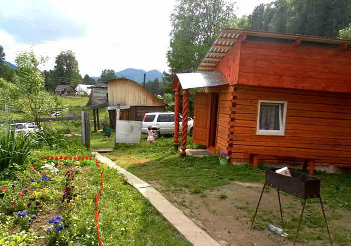 Хозяева турбазы предлагают проживание в домиках из сруба по демократичным ценам. Питание самостоятельное или в летнем кафе. За дополнительную плату будет организовано трехразовое питание из экологически чистых продуктов, выращенных на усадьбе. Вы отведаете как национальные блюда, вкуснейшую выпечку, так и вегетарианские, диетические по запросу. Жажду сможете утолить травяным чаем из трав, собранных в Алтае.
