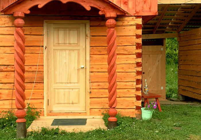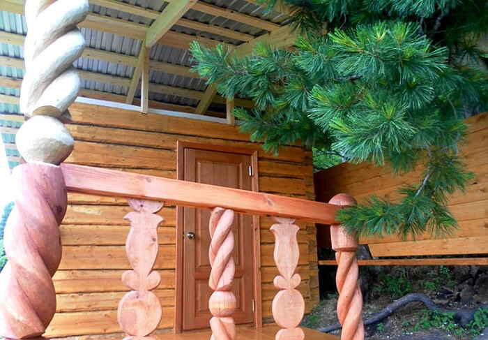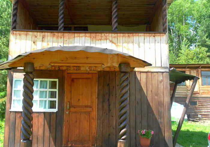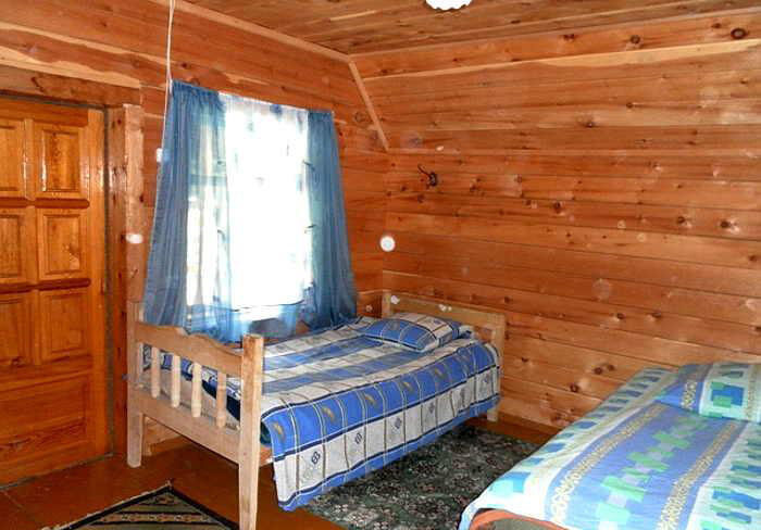 На первом этаже находятся две комнаты на шесть человек, а на второй этаж с улицы ведет лестница с витыми столбиками, которые вырезал хозяин усадьбы. На втором этаже тоже две комнаты, смежные. Ближняя ко входу — с 2-х спальной и односпальной кроватями, дальняя — с двумя односпальными.