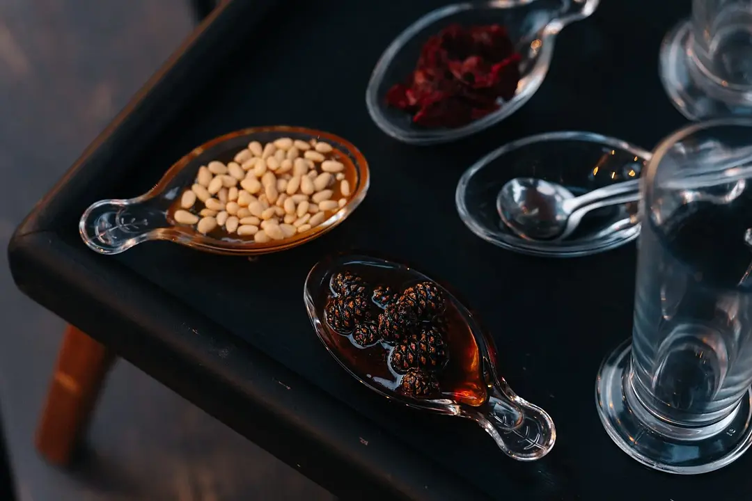 К чану подаем травяной чай с топпингами - мед с кедровыми орешками, варенье из сосновых шишек, вяленую клюкву.