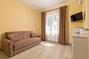 Двухкомнатный номер. В спальне двуспальная кровать. В гостиной диван, телевизор, обеденная зона. Чайник, СВЧ-печь, холодильник, набор посуды. С/у с душевой. Балкон-терраса.