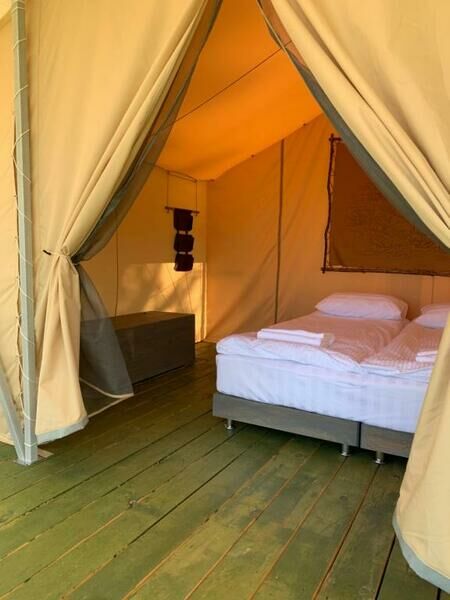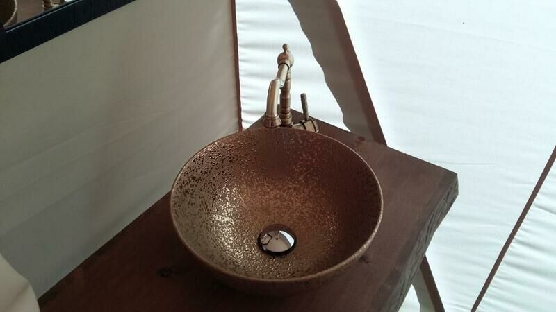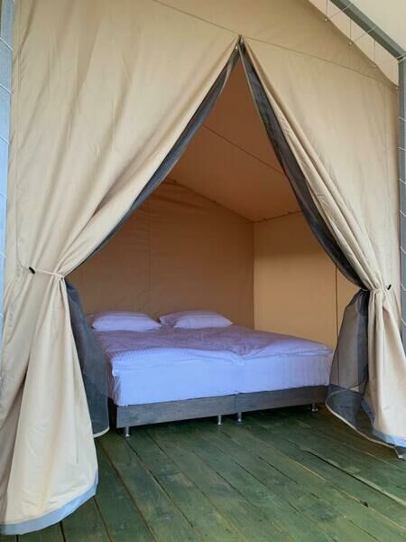 16 кв.м, двуспальная/2 односпальные кровати, душ, раковина, с/у на улице (отдельно для каждого шатра).