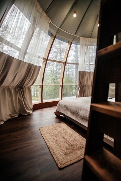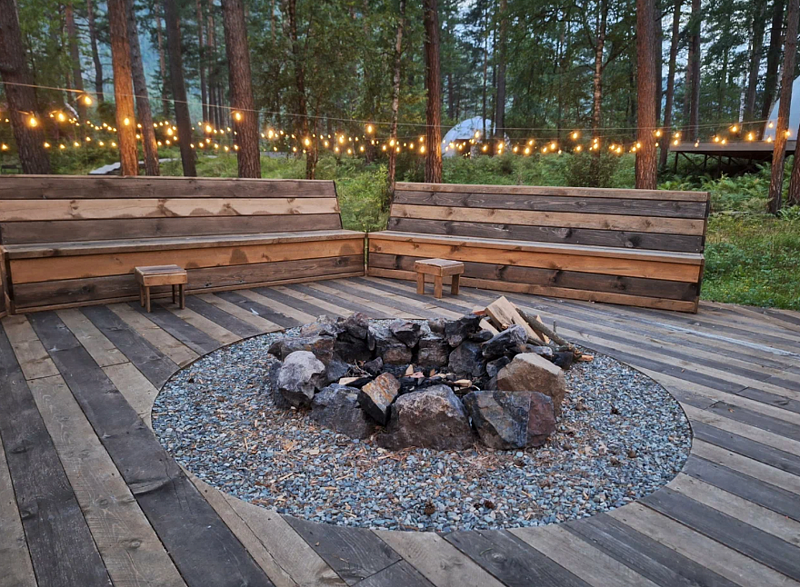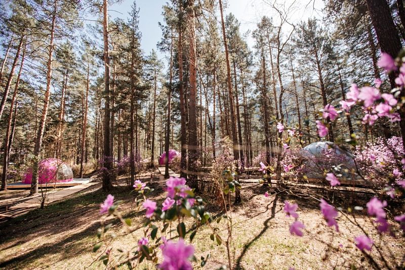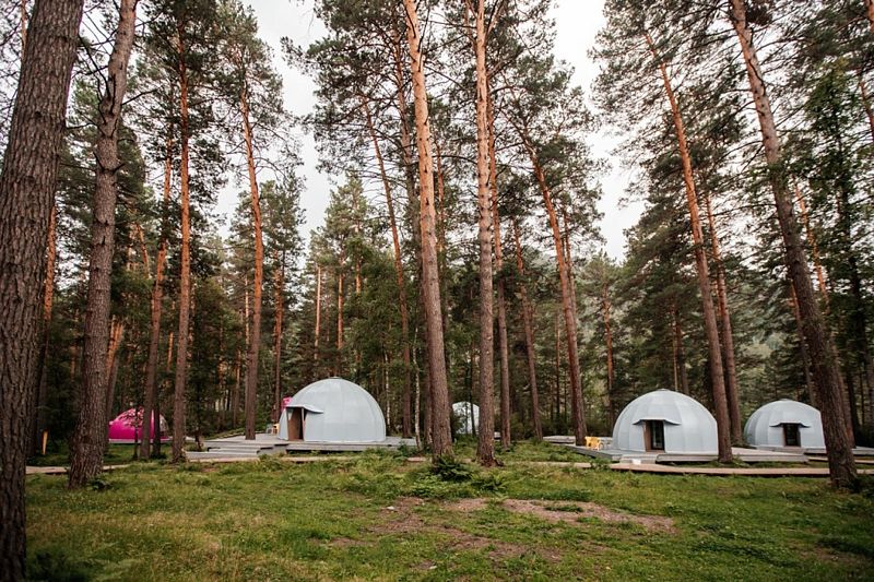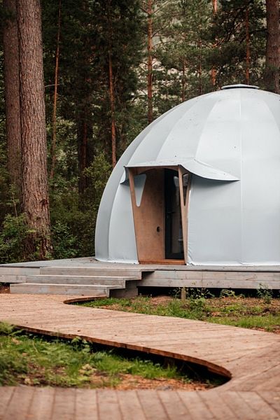 В глэмпинге создана территория осознанного отдыха, где можно переключить внимание от суеты на бесконечное течение жизни природы. Под кронами сосен располагаются 6 купольных номеров с панорамными окнами, ухоженная береговая линия и открытая площадка для отдыха или занятия йогой.