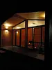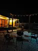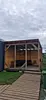 В доме панорамные окна, елки возле дома и терраса создают ощущение связи с природой, что делает его идеальным для отдыха и расслабления. Дом оснащен всем необходимым для комфортного проживания, включая ванную комнату, зеркало с подсветкой, фен, полотенца и гигиенический набор для каждой персоны, двуспальную кровать, раскладной диван, мини холодильник, обеденную зону, вешалку для одежды.