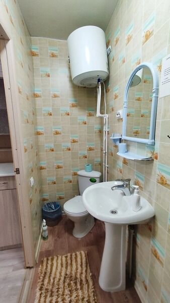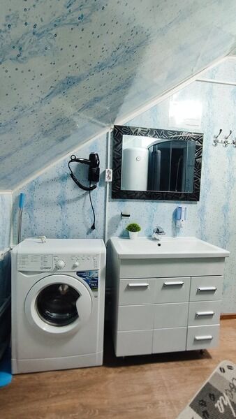 Санузел: холодная, горячая вода, душевая кабина, унитаз, раковина с тумбой, стиральная машина-автомат, зеркало, фен, жидкое мыло, шампунь, гель для душа.