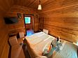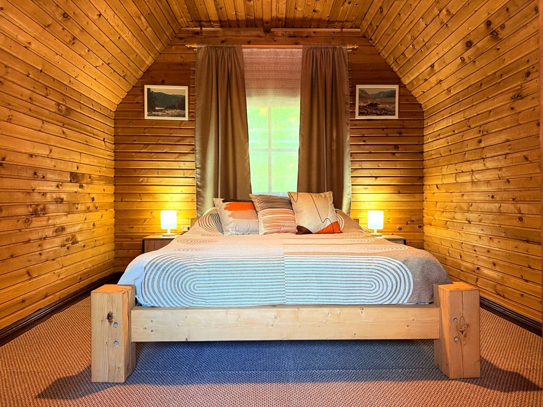 На базе для гостей предлагается двухэтажный дом для 5 человек с двумя спальнями: 1 этаж — двуспальная кровать и раскладной диван, на 2 этаже — двуспальная кровать.