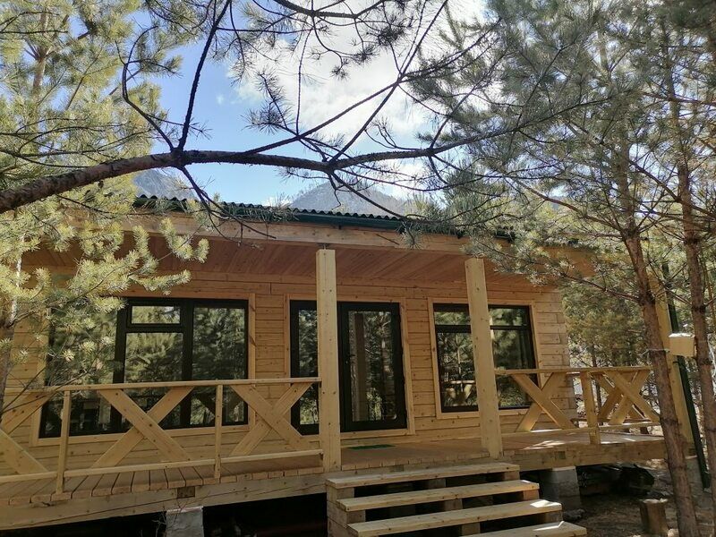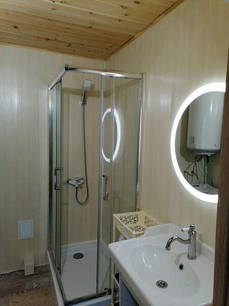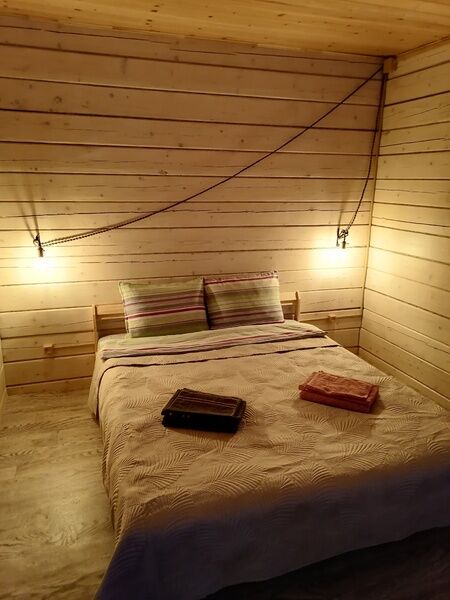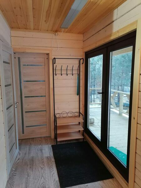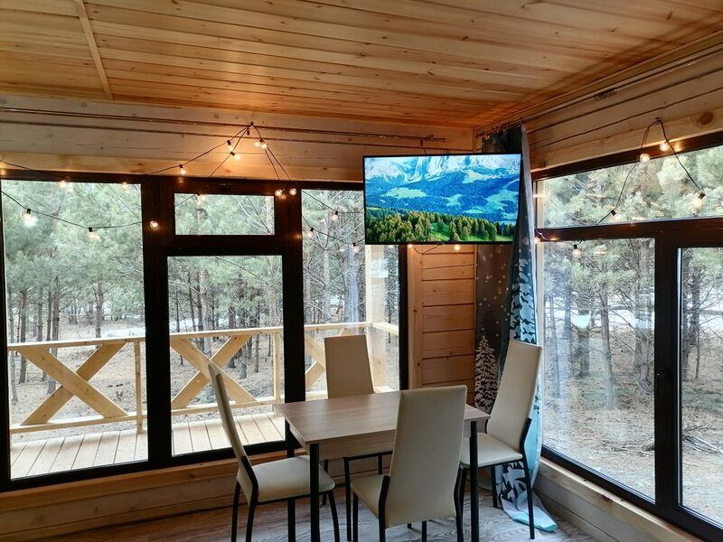 Дом с панорамными окнами и террасой выполнен из дерева. Из удобств гостям предлагается Smart-TV, Wi-Fi, фен, собственная ванная комната с современной сантехникой.