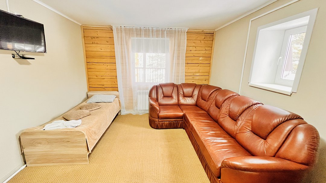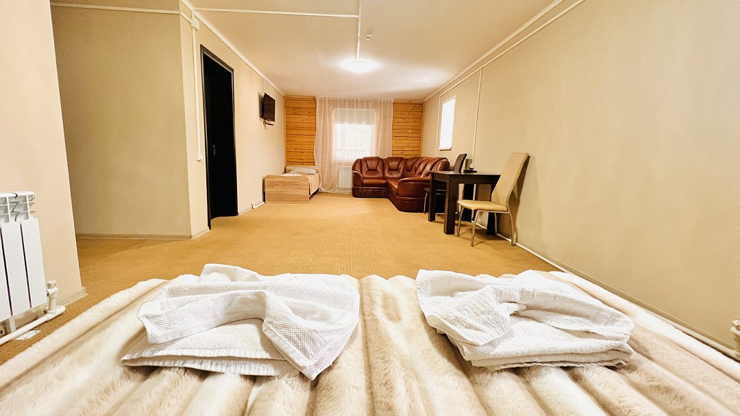 В номере: 1 двуспальная кровать, 1 односпальная кровать, 1 двуспальный диван.