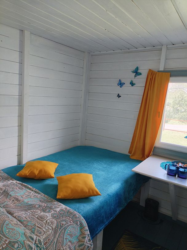 Каждый дом рассчитан на размещение троих человек. Спальные места представлены двуспальной и односпальной кроватями. А с террасы открывается потрясающий вид на реку и горы. Удобства находятся на улице.
