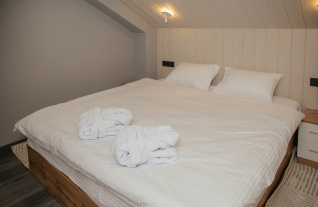Двухуровневый номер с эффектной планировкой для комфортного семейного отдыха с 1 двуспальной кроватью или 2 односпальными кроватями на выбор. Оформлен в скандинавском стиле. Идеальное решение для отдыха семьи до трех человек в горах.