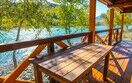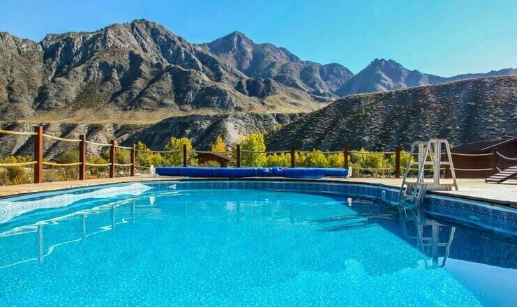 Ресторан базы отдыха окружен алтайскими горами, плавно перетекающими из одного образа в другой. Скалистые вершины, сменяются лесным высокогорьем. Таежный лес плавно переходит в ароматные луга, а правит всем величественная река Алтая - бирюзовая Катунь.