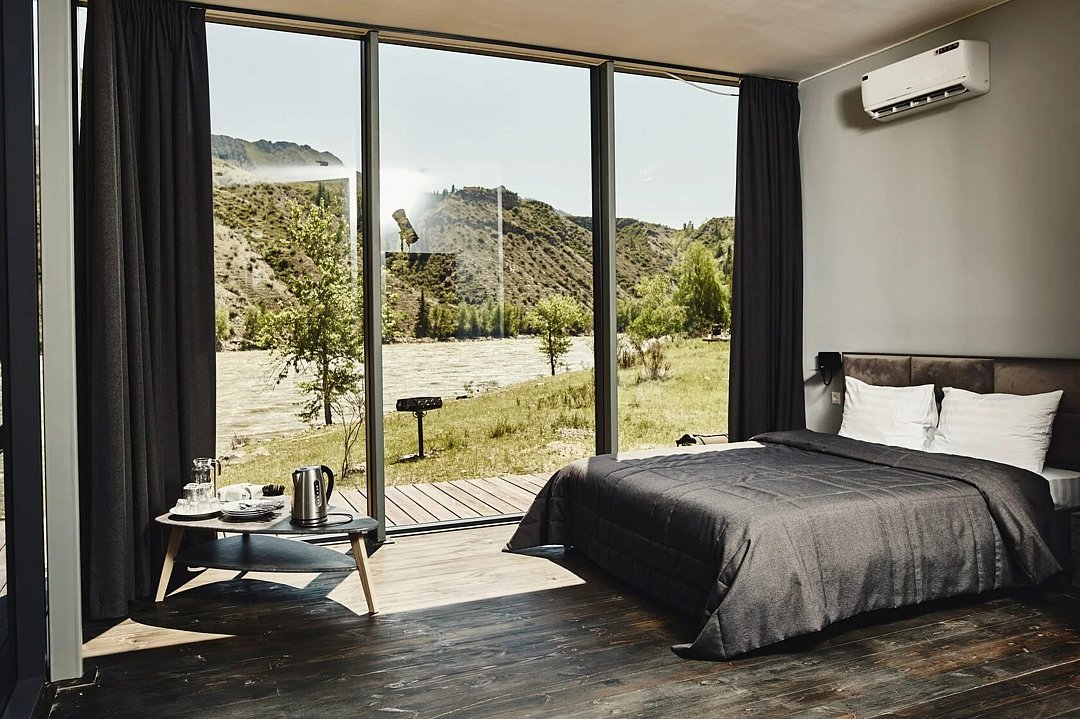 Большая двуспальная кровать, чайный набор, стол, кондиционер, душ, обогреваемый пол, фен, удобный диван, панорамное стена-окно с видом на Катунь и долину.