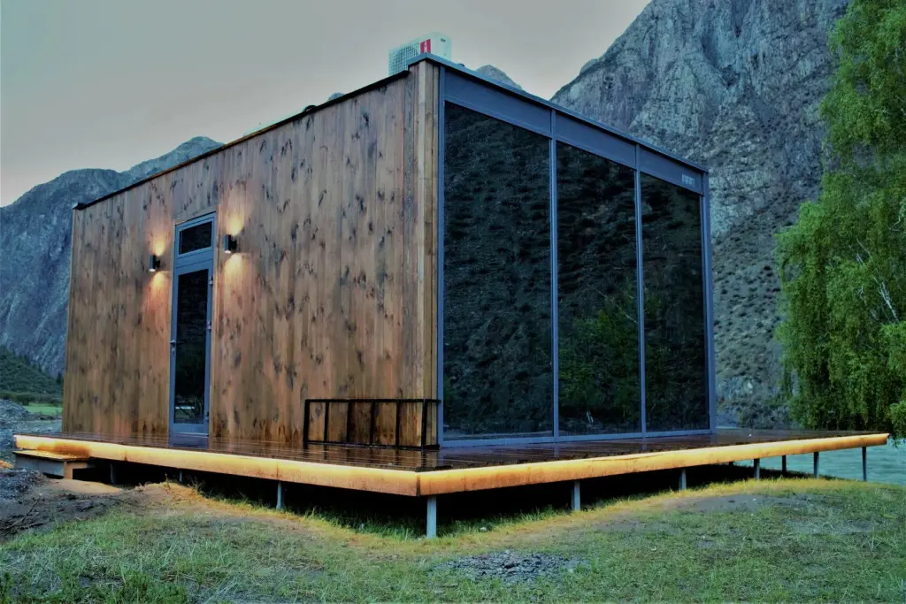 Большая двуспальная кровать, чайный набор, стол, стулья, кондиционер, душ, обогреваемый пол, фен, удобный диван, панорамное стена-окно с видом на Катунь и долину.