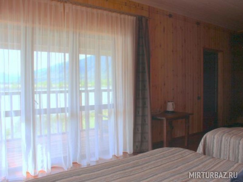 В номере: большая двуспальная кровать, односпальная кровать, прикроватные тумбы, чайник, чайный набор, стол, стулья, платяной шкаф, вешалки для одежды, обогреватель, большое панорамное окно до пола с видом на Катунь и долину, просторный балкон.