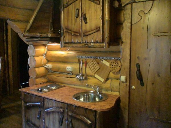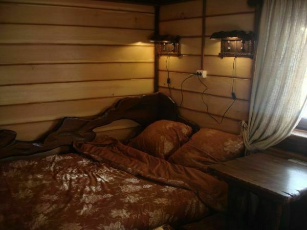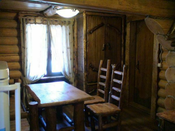 - Второй этаж, двухкомнатный номер (гостиная с кухней, спальня, туалетная комната с душем). Балкон. Авторская мебель из дерева, эксклюзивный дизайн интерьера.