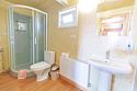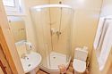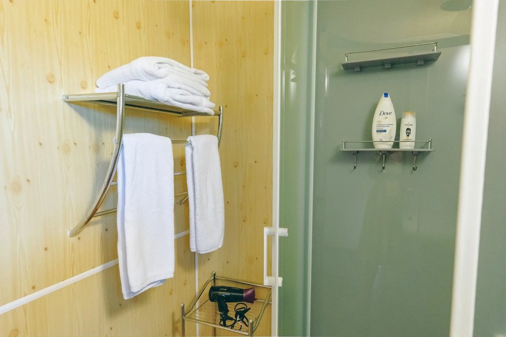 В санузле располагается душевая кабина с раздвижными стеклянными шторками, унитаз, раковина, тумбочка, туалетно-косметические принадлежности ,белоснежные пушистые полотенца, фен.