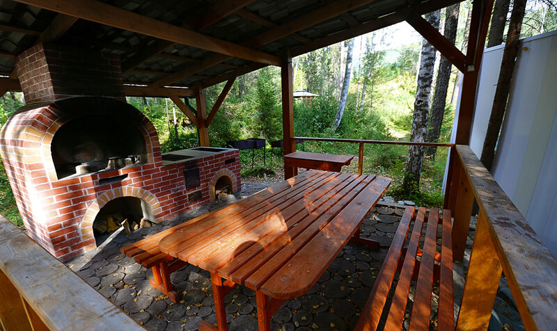 Отдыхающие также могут выбрать более уединенный тип размещения в летних благоустроенных домиках, которые находятся в глубине территории. В домиках могут жить одновременно до 4-х человек. Здесь есть гостевая и спальная зоны, санузел со всеми удобствами, просторная веранда с летней мебелью.