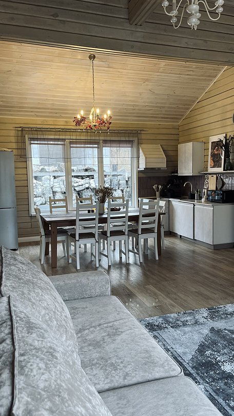 Коттедж с прекрасным видом на Катунь и горы. В доме большой зал, совмещенный с кухней, с большим столом на компанию. В кухне есть посуда для приготовления пищи, микроволновка, посудомоечная машина, холодильник, теплый пол.