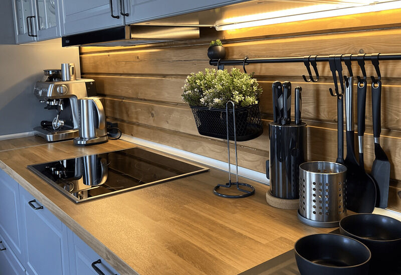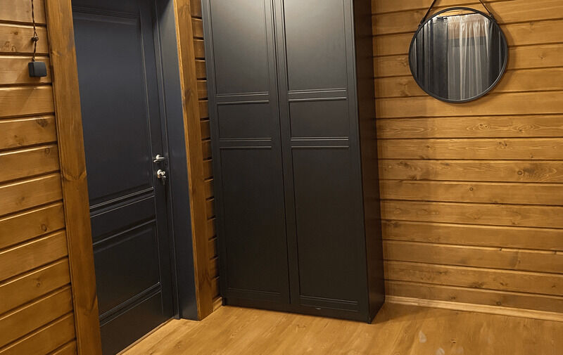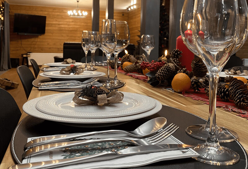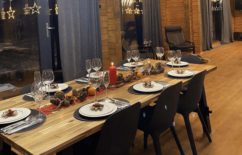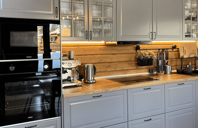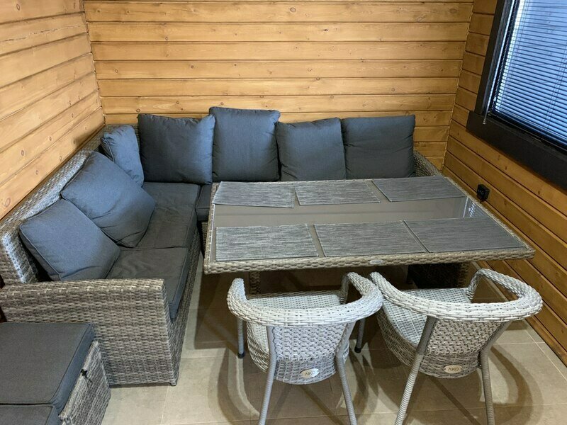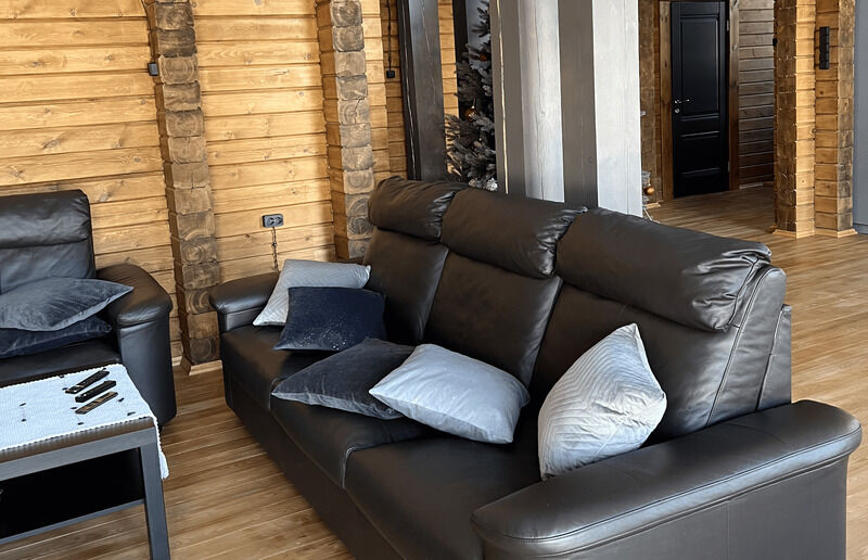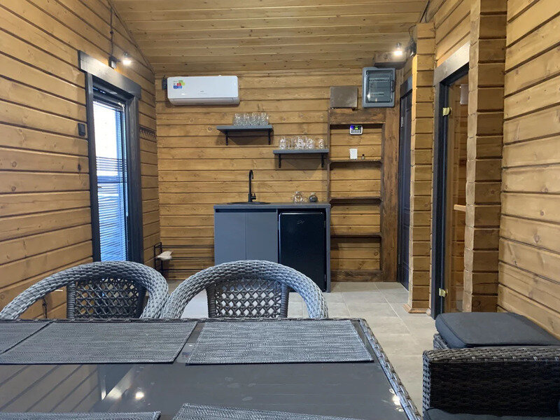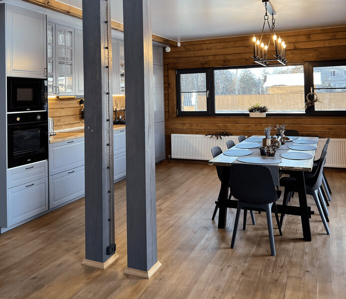 Коттедж полностью оснащен для комфортабельного отдыха. На первом этаже – просторная гостиная с кухонной и обеденной зоной. Кухня предусматривает всю необходимую посуду и бытовую технику – холодильник, микроволновую печь, духовой шкаф, варочную панель, посудомоечную машину, кофеварку и чайник.