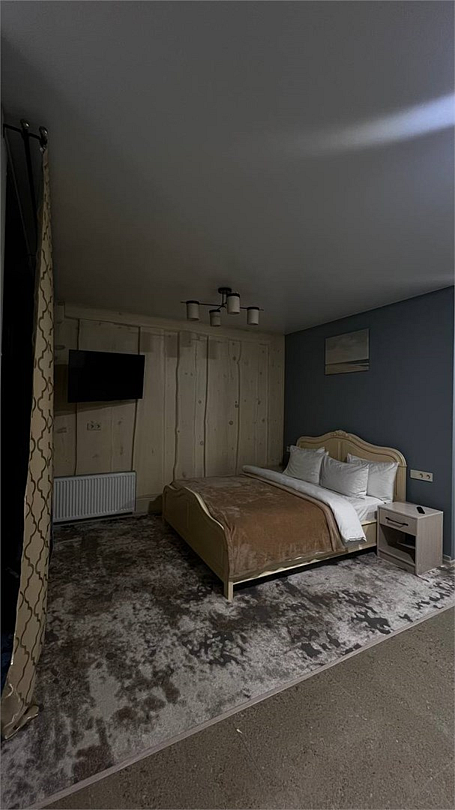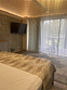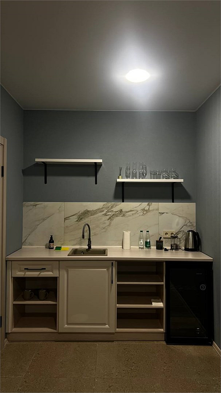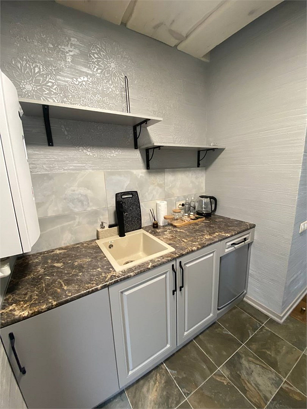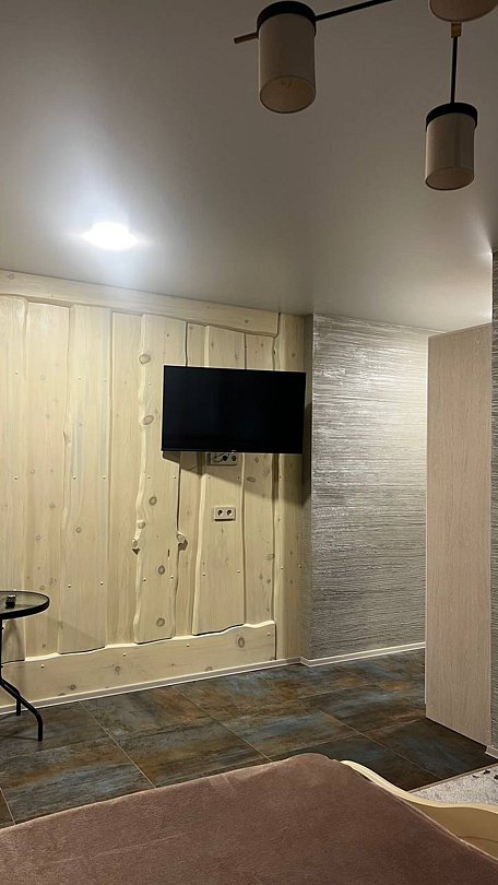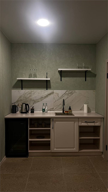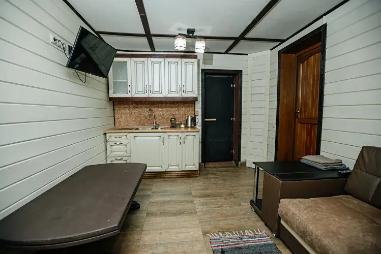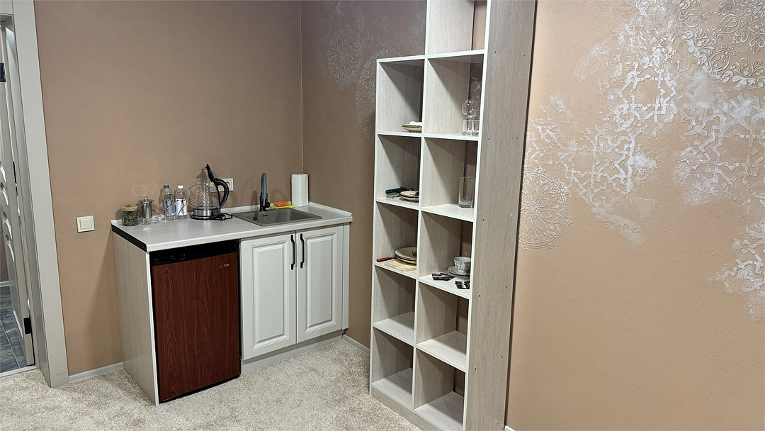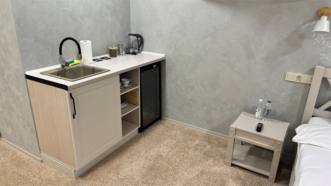 Новый номер с небольшой кухней: холодильник, чайник и посуда — всё под рукой. Номер с одной двуспальной кроватью.