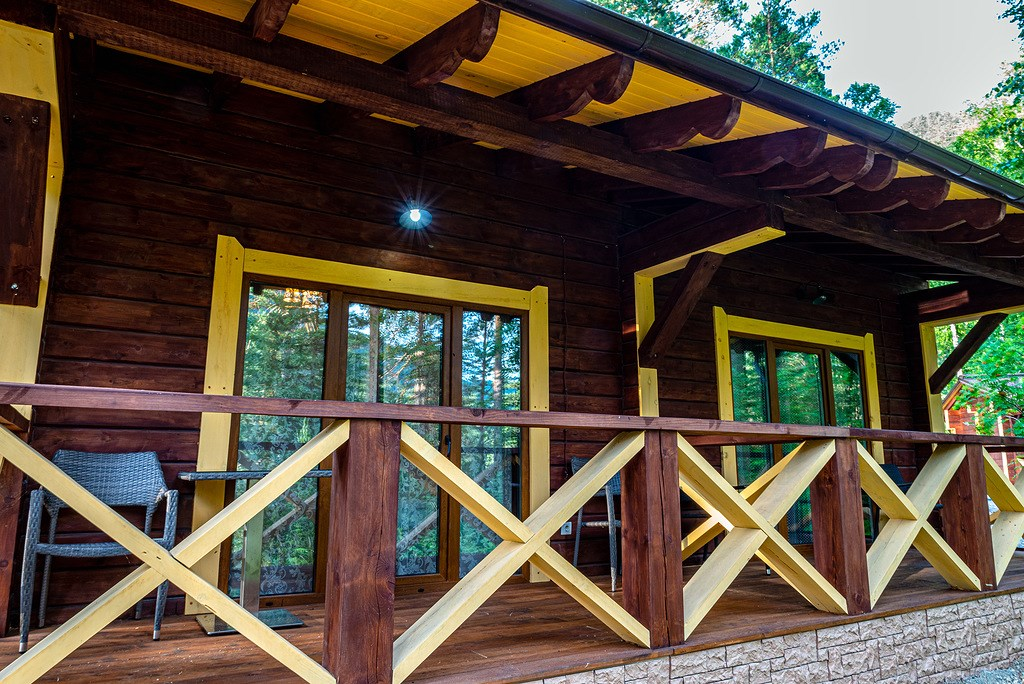 Отдельно стоящий номер в доме с видом на реку Катунь, террасой и небольшой кухней: холодильник, чайник и посуда — всё под рукой. В каждом домике два номера с отдельными входами, рассчитаны на двоих с возможностью двух дополнительных мест.
