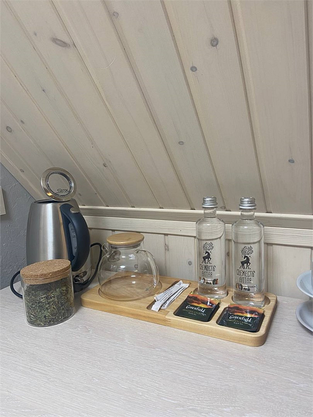 Новый номер с небольшой кухней: холодильник, чайник и посуда — всё под рукой. Номер с одной двуспальной кроватью и собственной террасой.