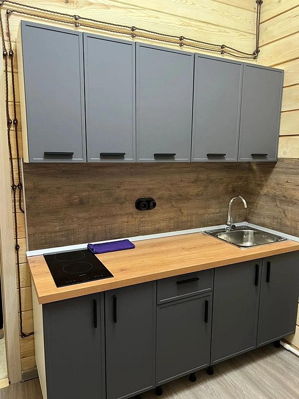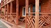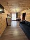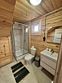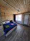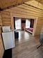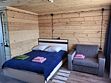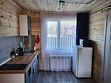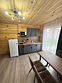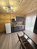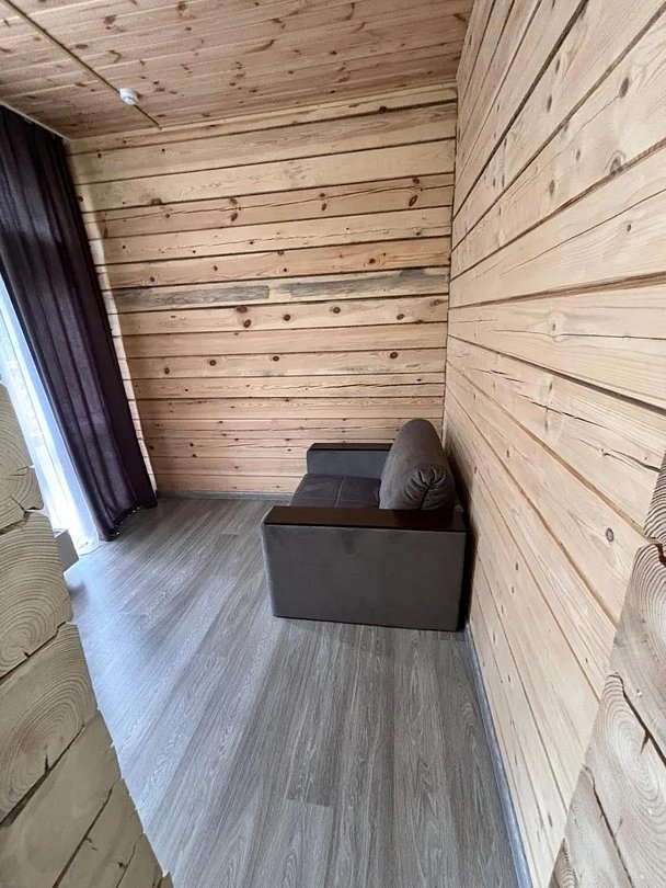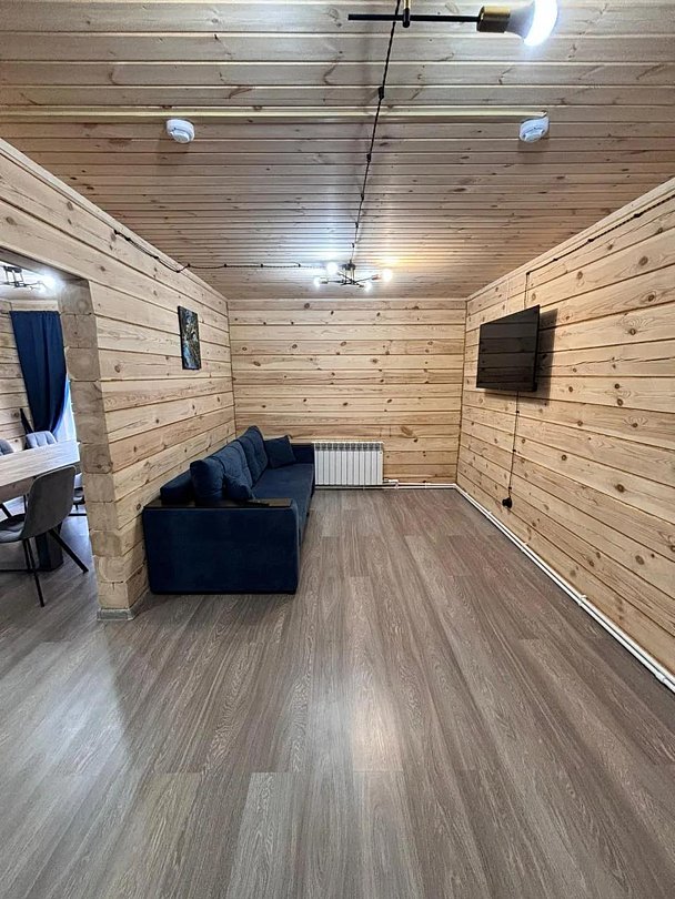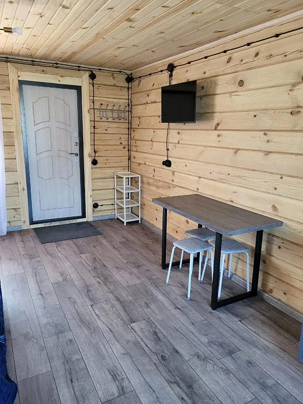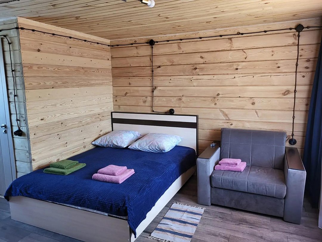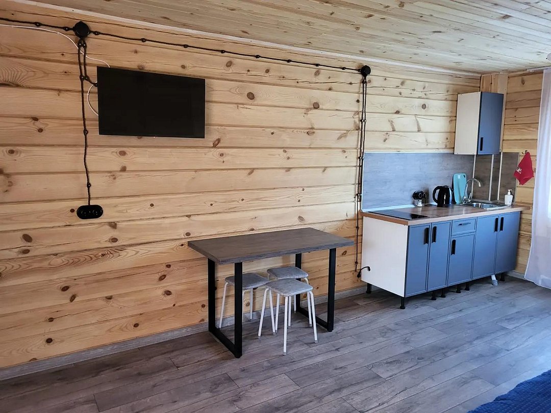 Деревянный коттедж состоит из 2 номеров площадью 25 м2 и 1 номера площадью 56 м2. Данный номер находится на первом этаже и состоит из кухни-студии, есть двуспальная кровать, раскладывающееся кресло, телевизор, комод, санузел, душевая кабина, раковина.