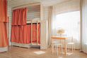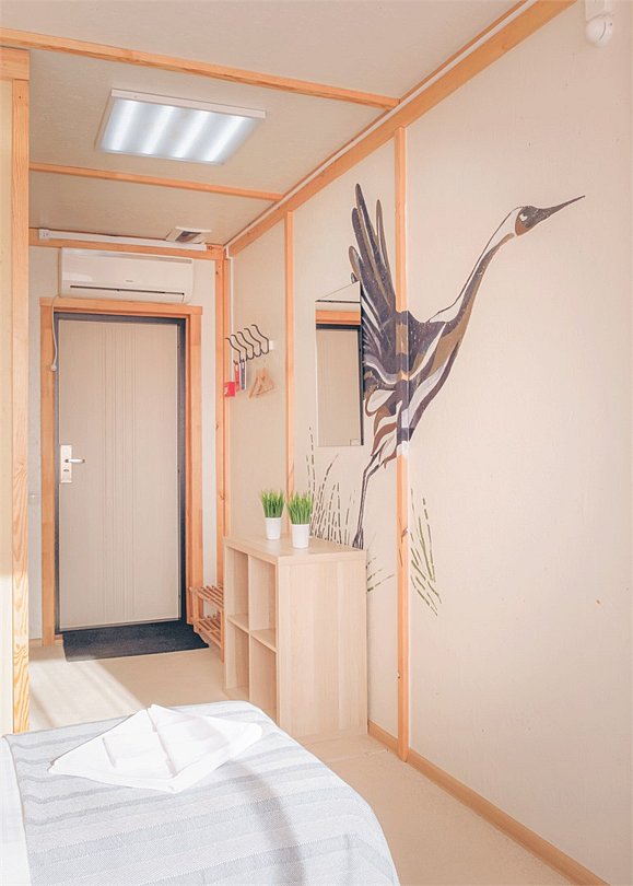 Для каждого спального места: небольшой шкафчик для вещей, индивидуальный светильник, розетка, шторка. Полотенца. Стол, 8 табуретов. Чайник, чайные пары, чай, питьевая вода.