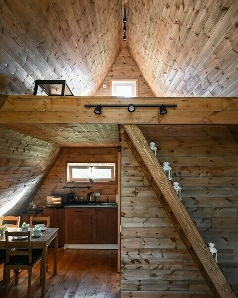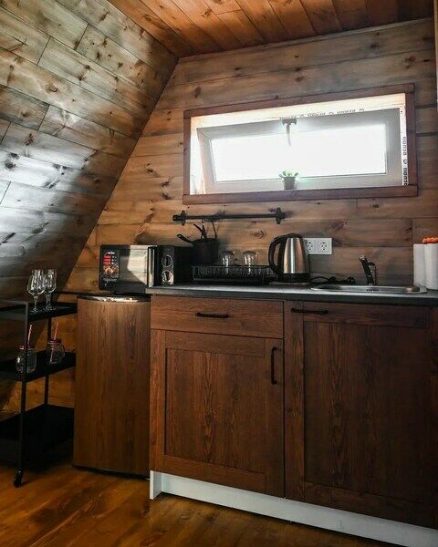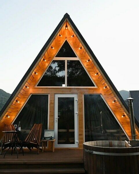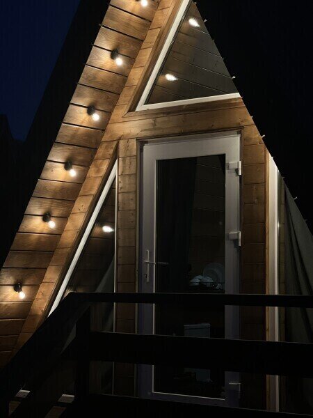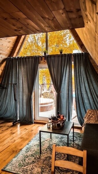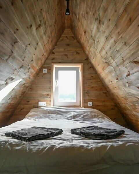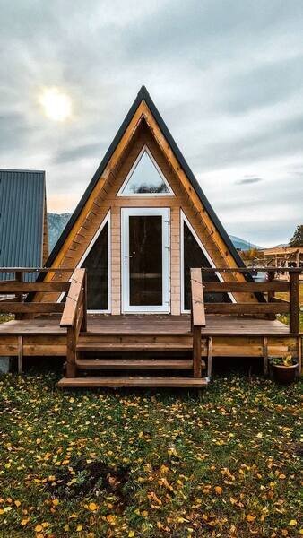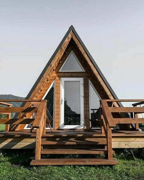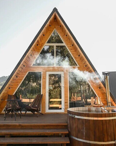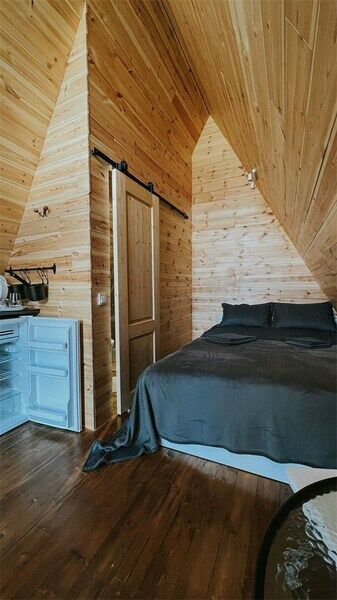 A-frame домики благоустроены всем необходимым для проживания. Они оснащены удобным спальным местом, обеденной зоной и собственной ванной комнатой. Помимо этого, гостям предоставляется возможность самостоятельной готовки, ведь кухни оборудованы плитой, холодильником и микроволновой печью.