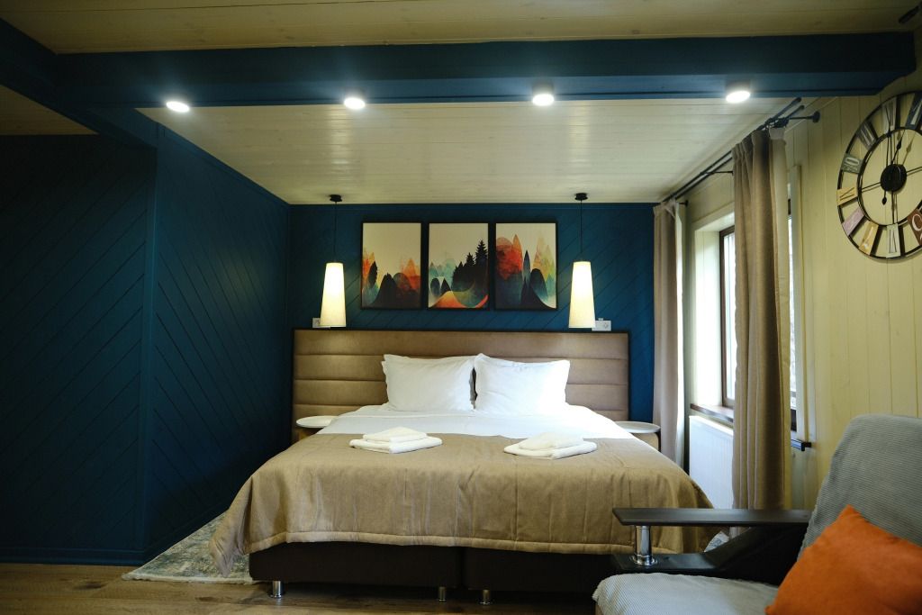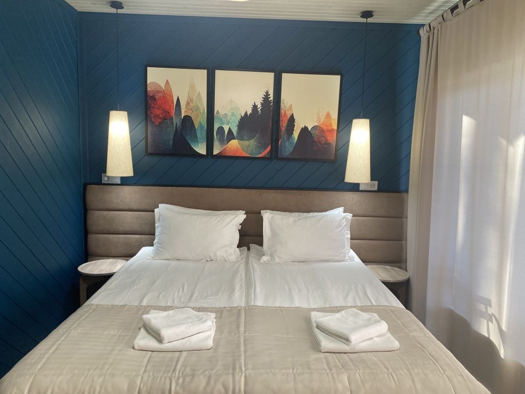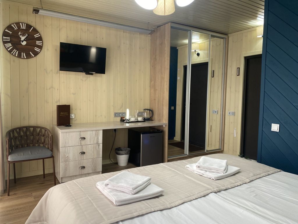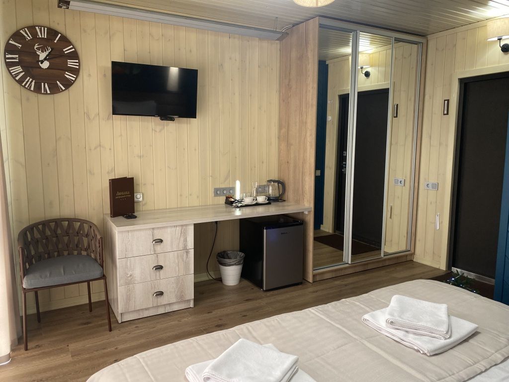 Одна двуспальная кровать (1,6 м), душевая, холодильник, телевизор, чайник, фен, сейф, полотенца -— 3 на 1 персону, средства личной гигиены (шампунь, мыло), тапочки, швейный набор, чай и кофе в день заезда, вода питьевая из собственной скважины, Wi-Fi.