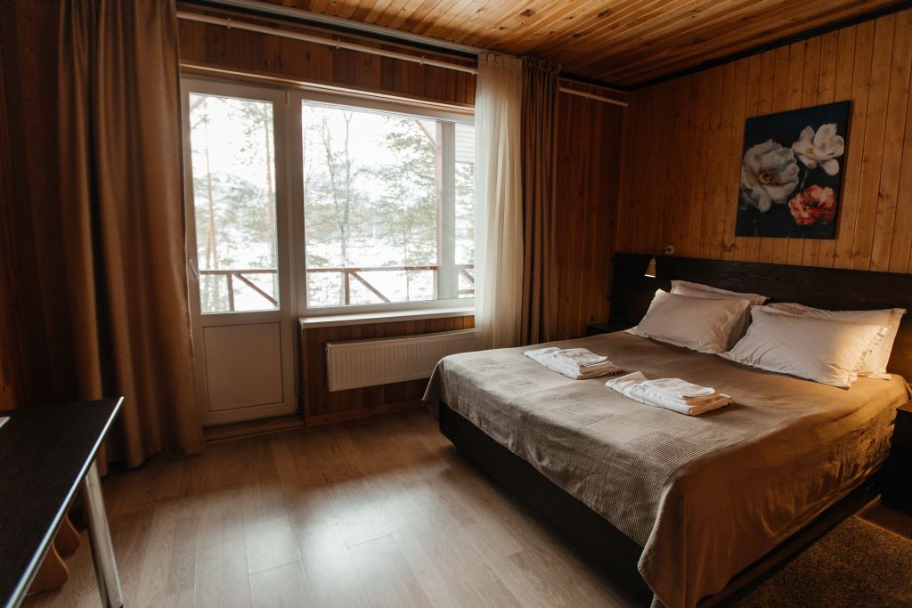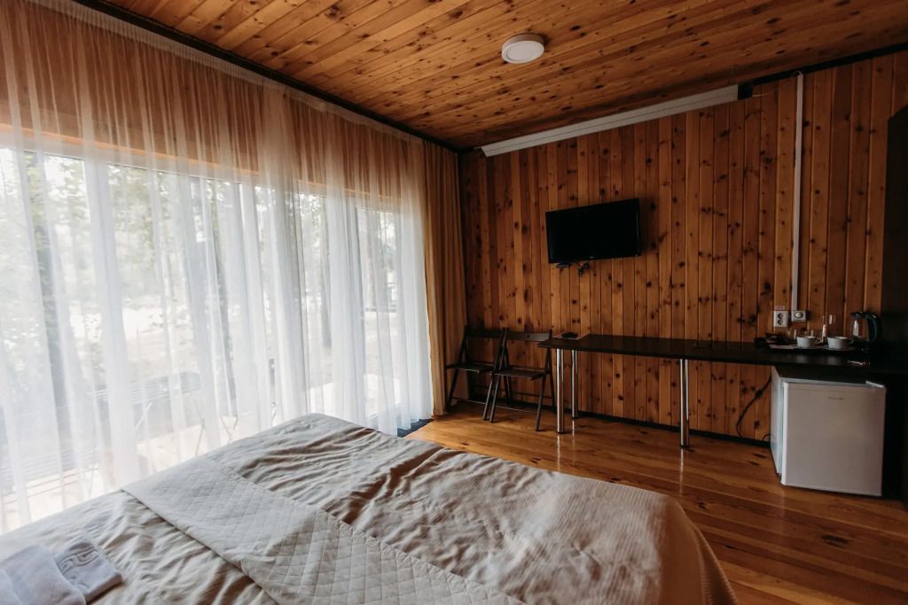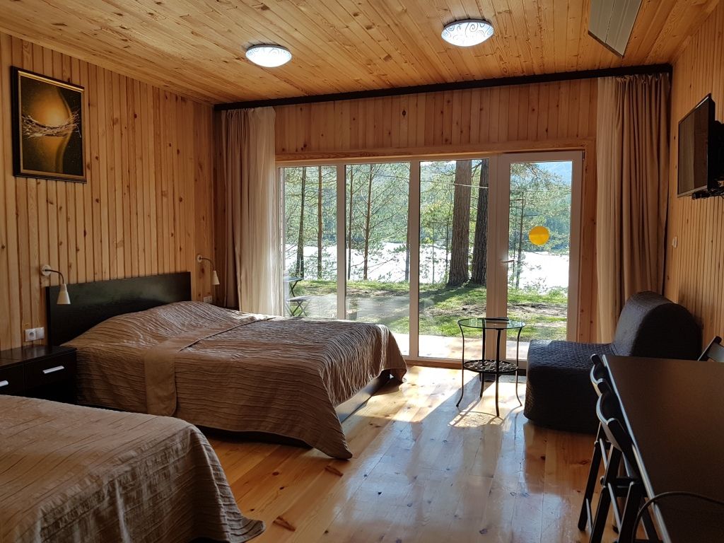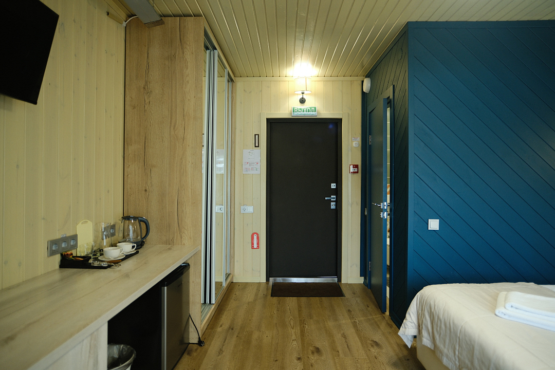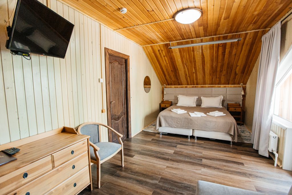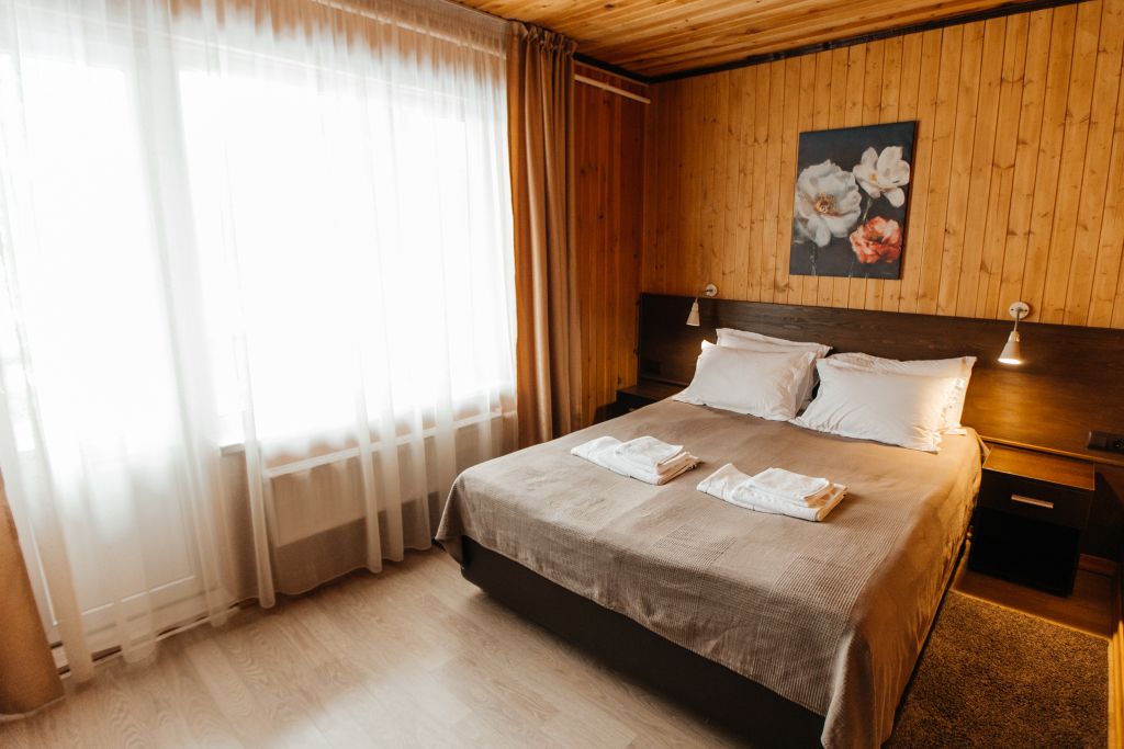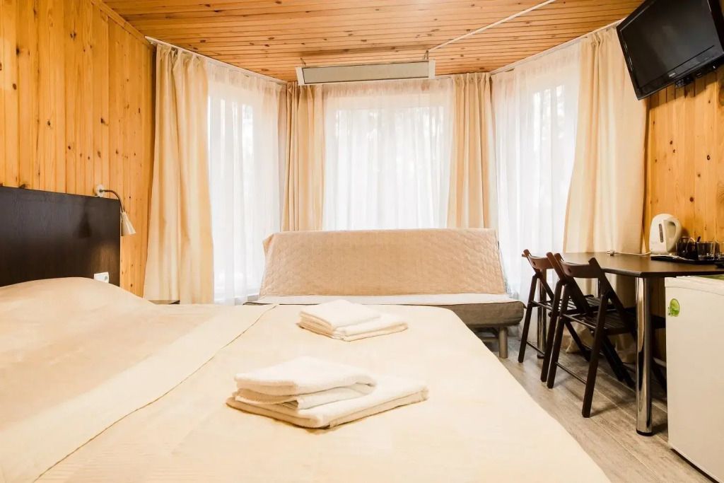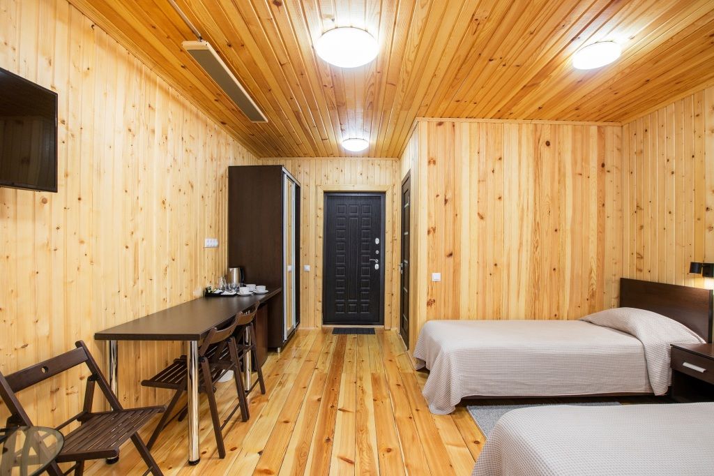 Одна двуспальная разделяемая кровать (1,8 м), или две односпальные кровати (0,9 м), диван-книжка, душевая, холодильник, телевизор, чайник, фен, сейф, полотенца — 3 на 1 персону, средства личной гигиены (шампунь, мыло), тапочки, швейный набор, чай и кофе в день заезда, вода питьевая из собственной скважины, Wi-Fi. Вид на сосновый бор и территорию отеля.