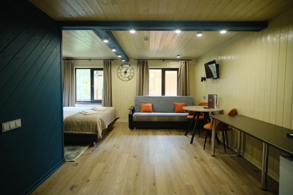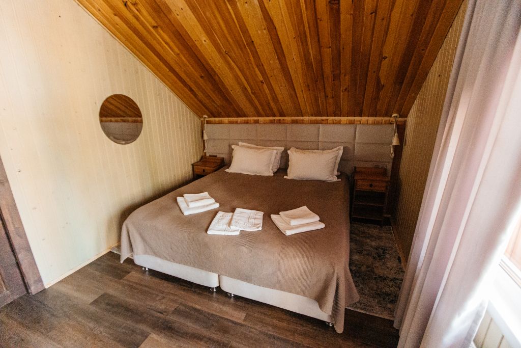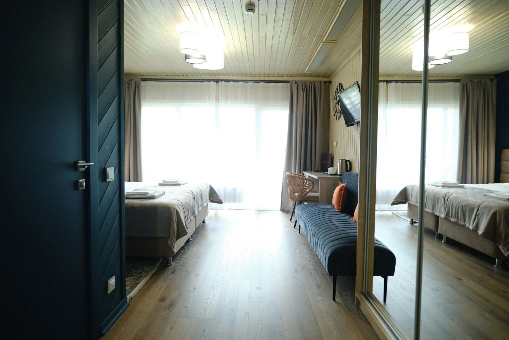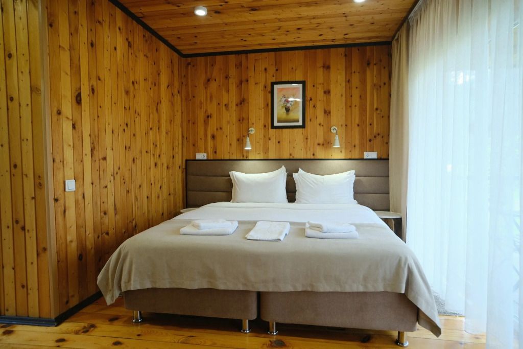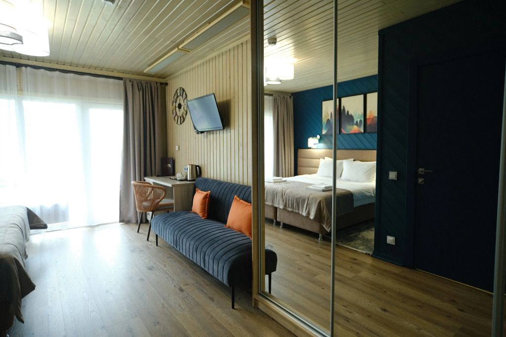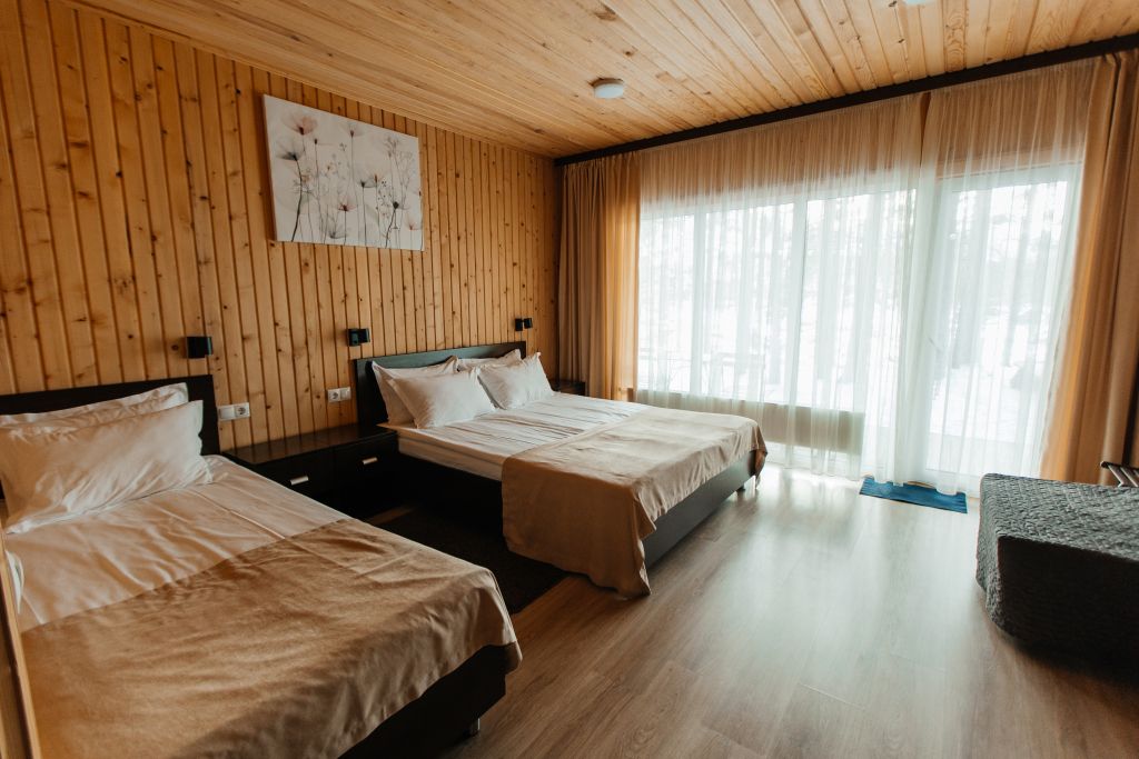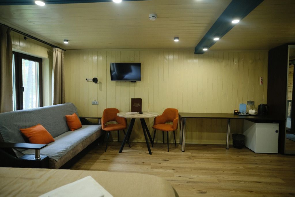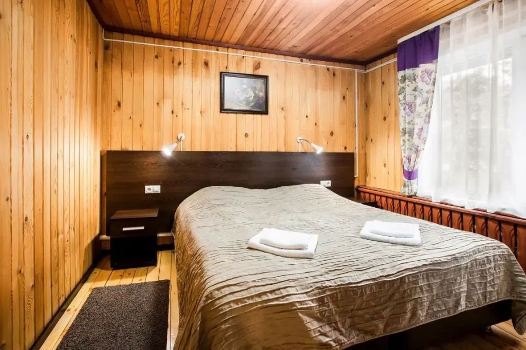 Одна двуспальная разделяемая кровать (1,8 м), или две односпальные кровати (0,9 м), диван-книжка, душевая, холодильник, телевизор, чайник, фен, сейф, полотенца — 3 на 1 персону, средства личной гигиены (шампунь, мыло), тапочки, швейный набор, чай и кофе в день заезда, вода питьевая из собственной скважины, Wi-Fi. Вид на сосновый бор и территорию отеля.