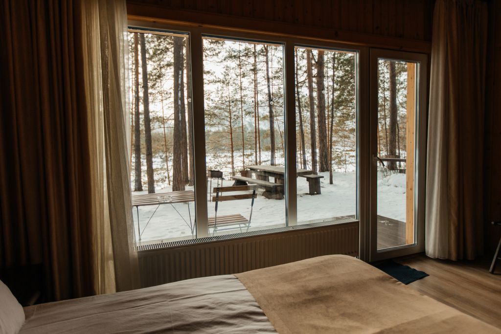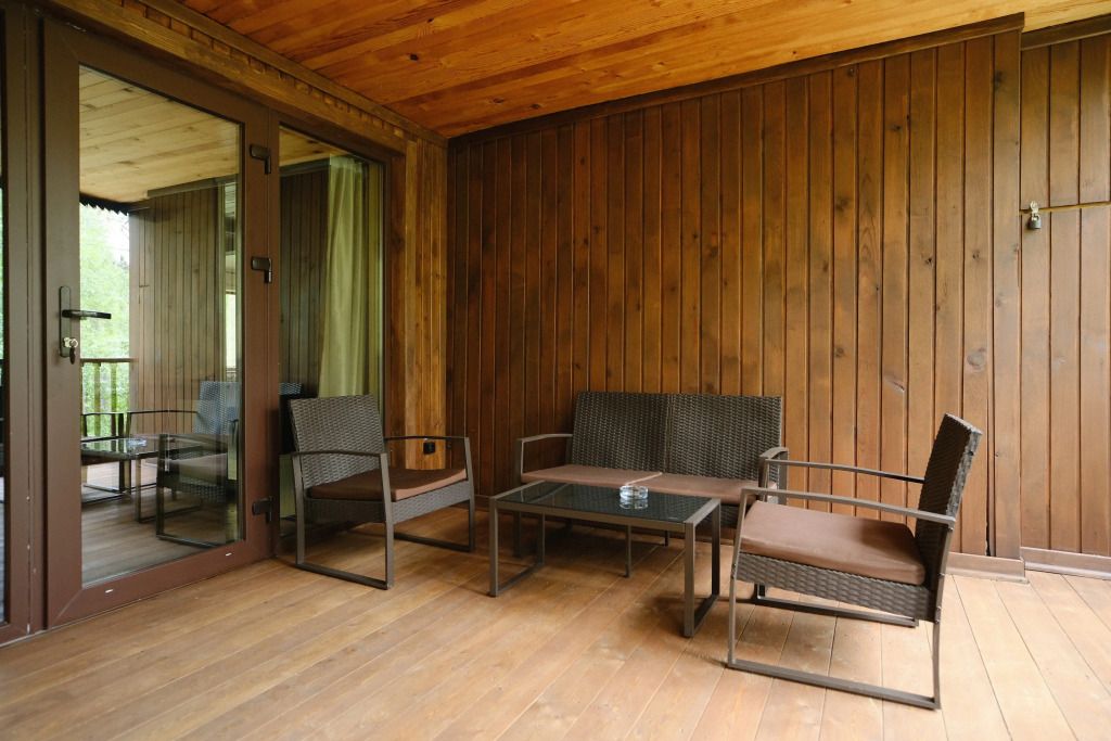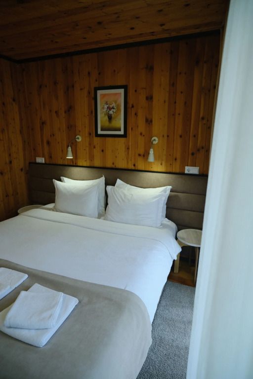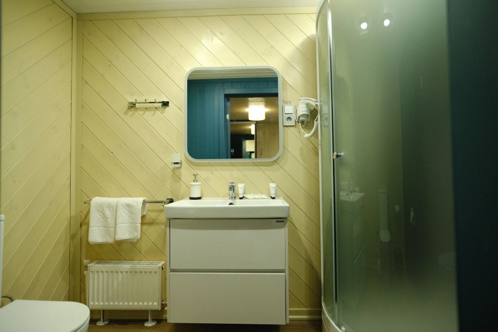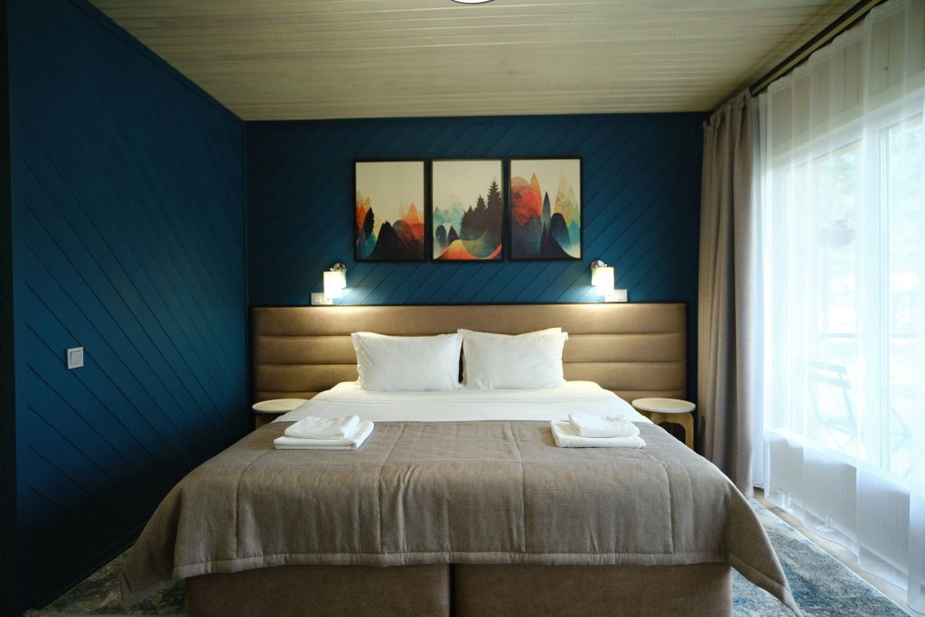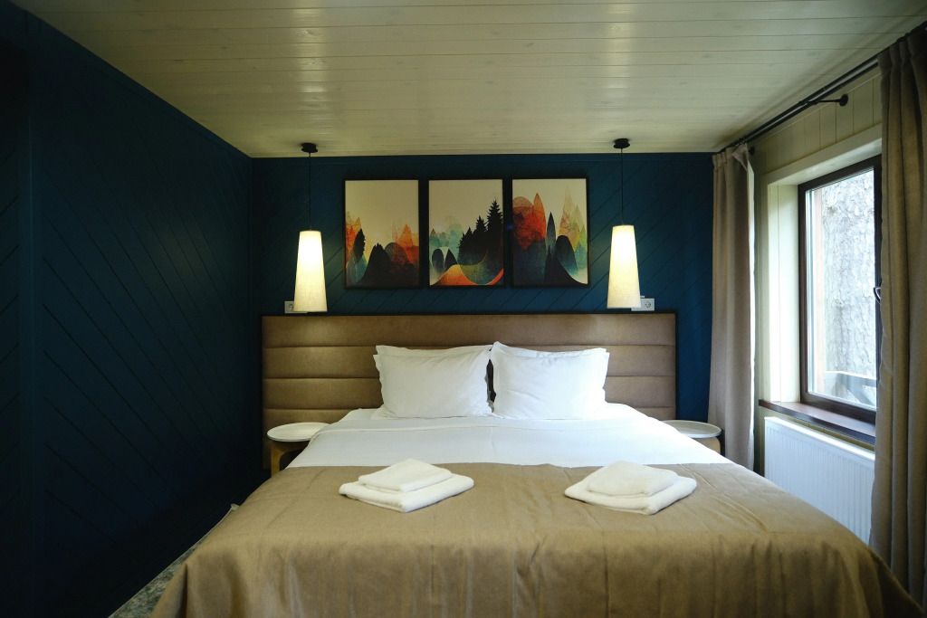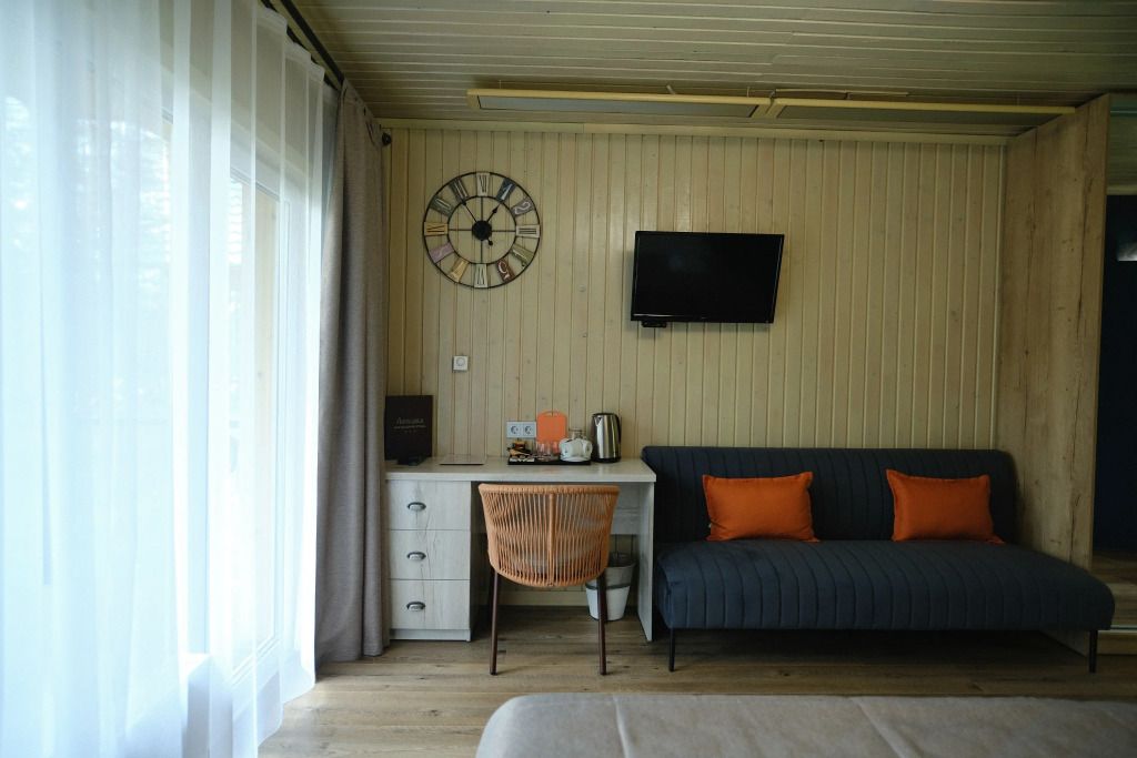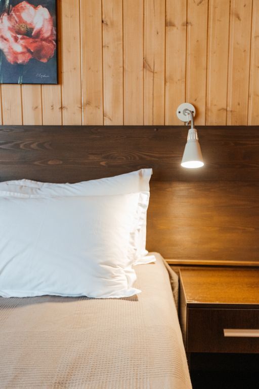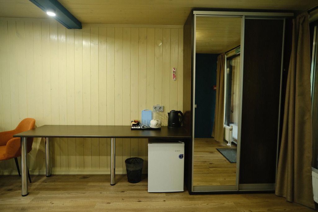 Одна двуспальная разделяемая кровать (1,8 м), или две односпальные кровати (0,9 м), диван-книжка, душевая, холодильник, телевизор, чайник, фен, сейф, полотенца — 3 на 1 персону, средства личной гигиены (шампунь, мыло), тапочки, швейный набор, чай и кофе в день заезда, вода питьевая из собственной скважины, Wi-Fi. Вид на сосновый бор и территорию отеля.