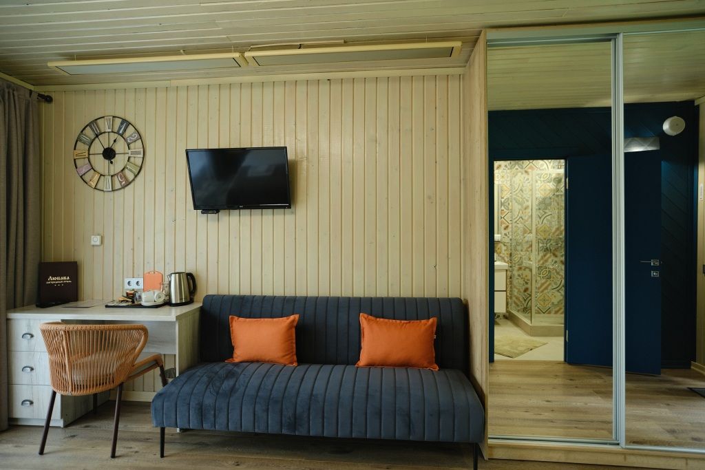 2-х спальная кровать (1,8 м) или две односпальные кровати (0,9 м), раздвижной диван в гостиной, стол и стулья; платяной шкаф и шкаф в гостиной, терраса с видом на реку, кухонный гарнитур (без плиты), чайник; холодильник, набор посуды, артезианская вода из собственной скважины, чай и кофе в день заезда, телевизор - 2 шт., Wi-Fi, сейф и кнопка вызова персонала, утюг и гладильная доска, санузел с душевой кабиной, комплект полотенец, халаты, фен, индивидуальный гигиенический набор.
